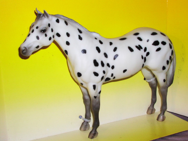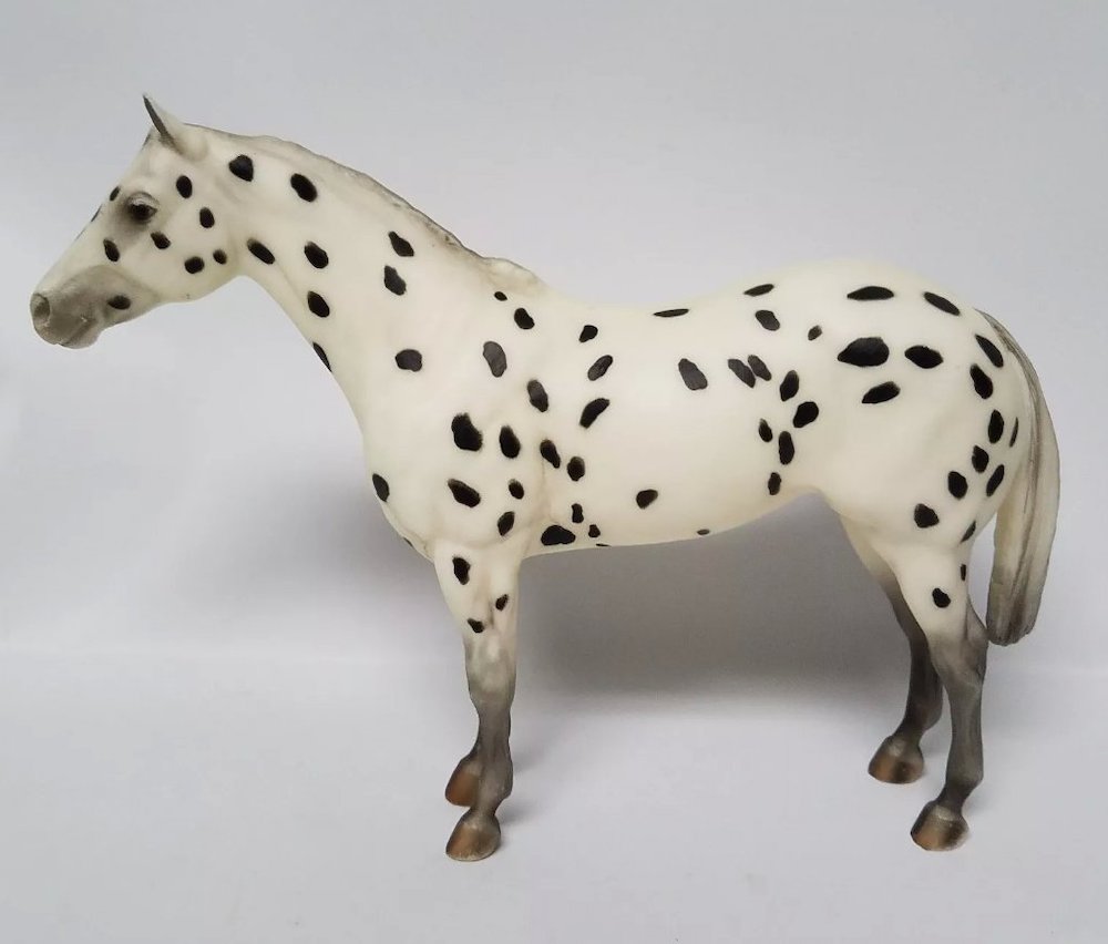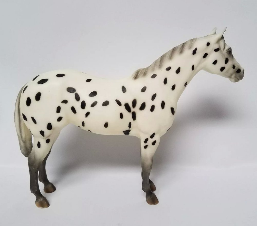 Matte black leopard appaloosa; white with stenciled black spots; dark grey legs; striped hooves