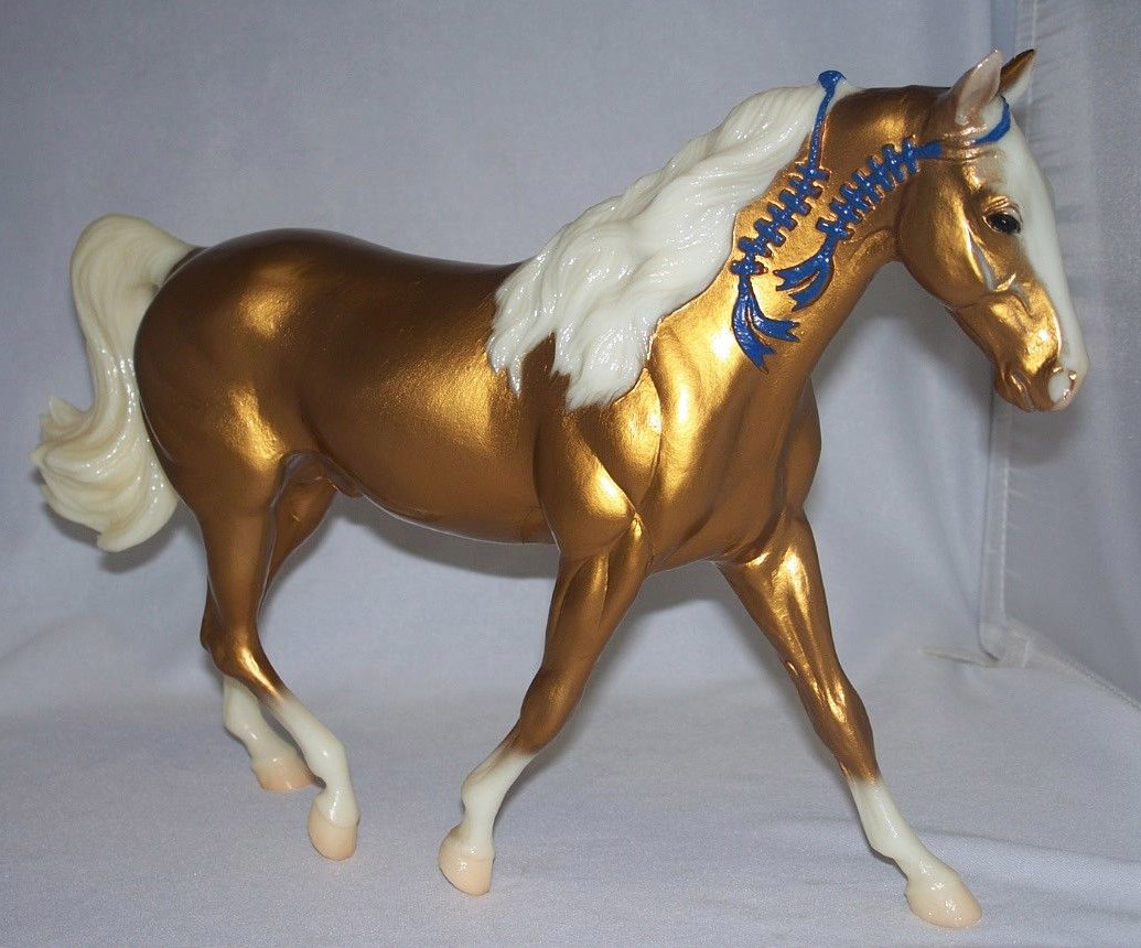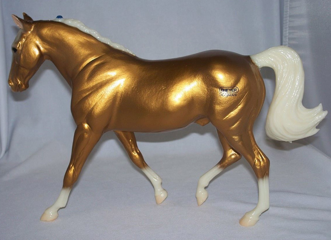 Glossy gold charm; bald face; 4 socks; blue ribbons; “Breyer 50 Years” on hip; JAH SR; 1/750