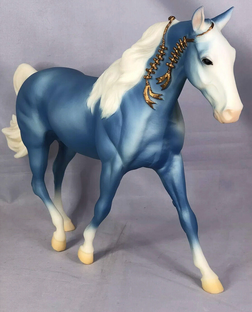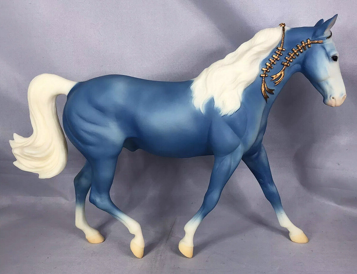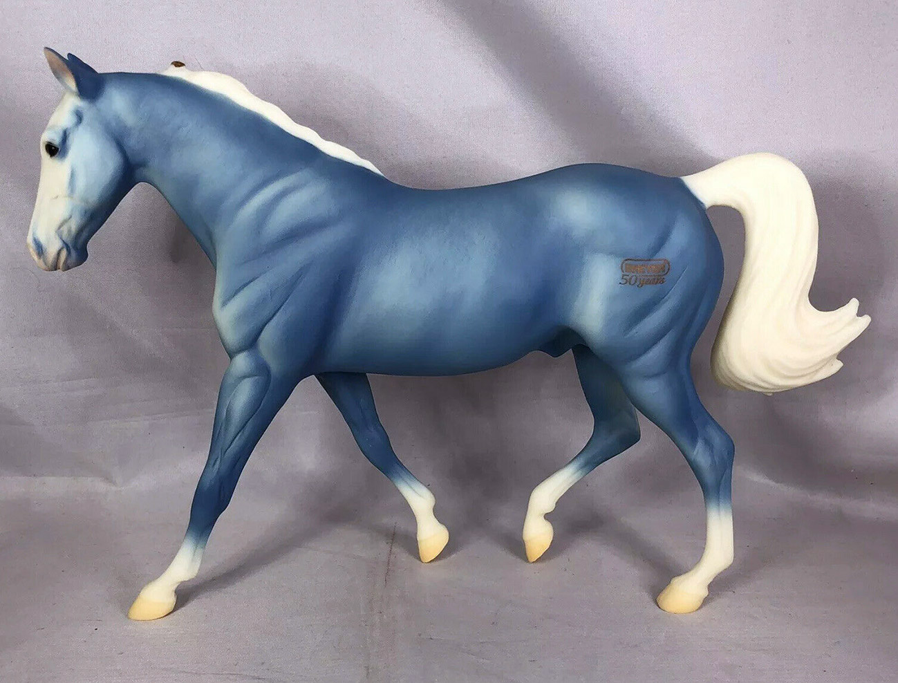 Wedgewood blue; bald face; 4 socks; gold ribbons; “Breyer 50 Years” on hip; JAH SR; 1/750