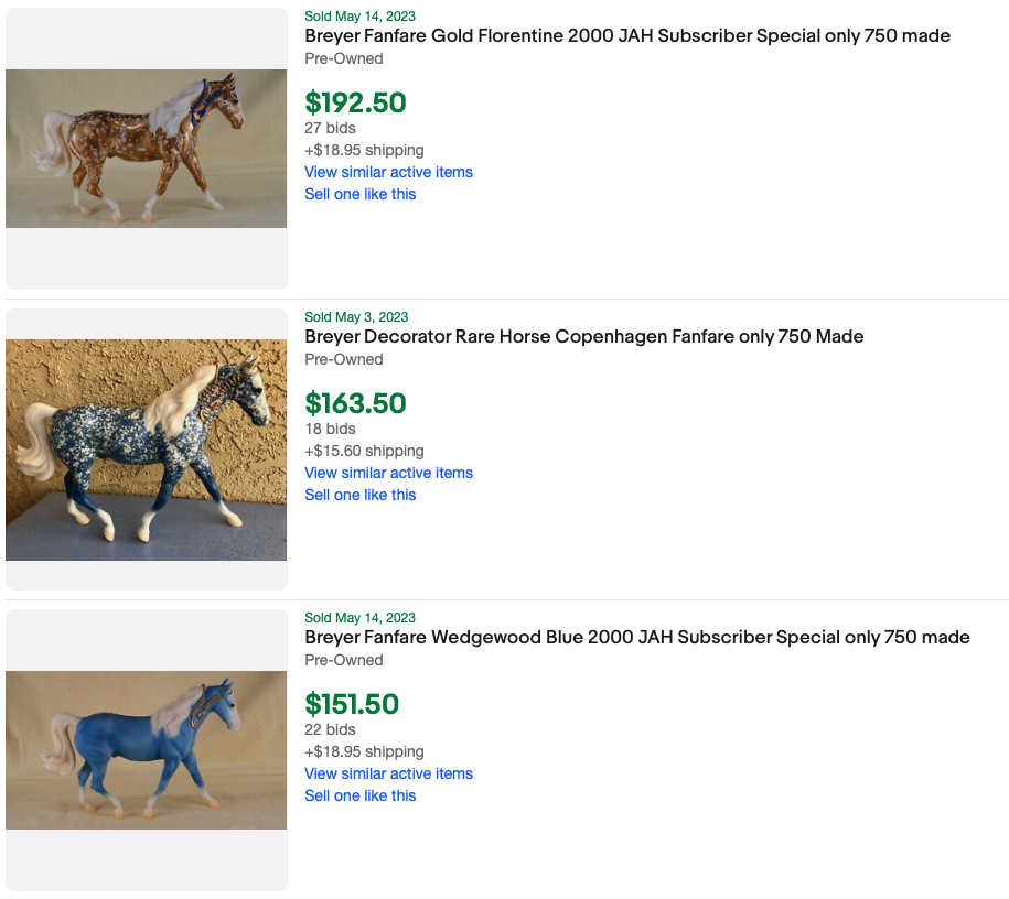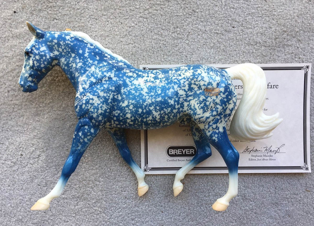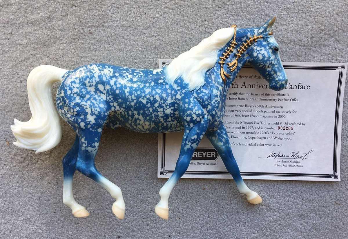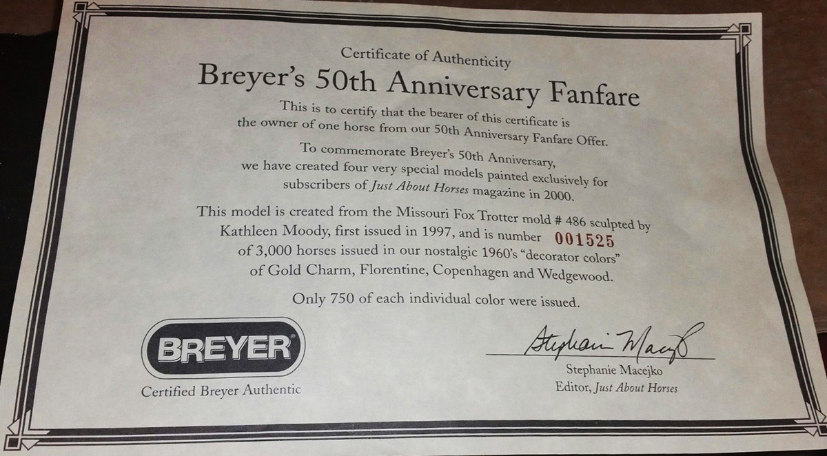 Glossy Copenhagen; bald face; 4 socks; gold ribbons; “Breyer 50 Years” on hip; JAH SR; 1/750