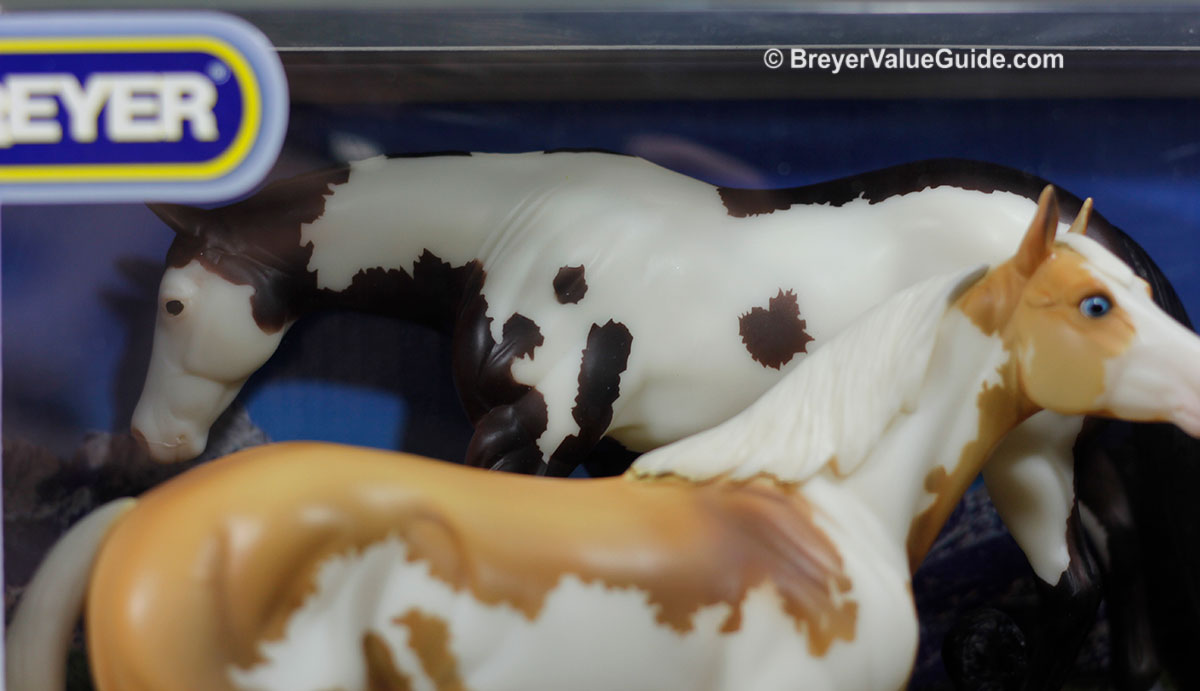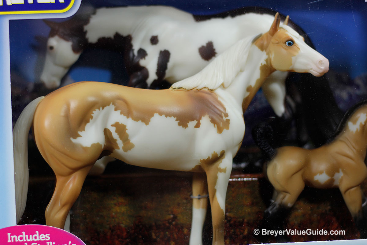 Matte palomino pinto; stenciled bald face; blue eye; 1 short sock; 2 stockings; Tractor Supply SR – with American Quarter Horse Mare; Trotting Stock Horse Foal