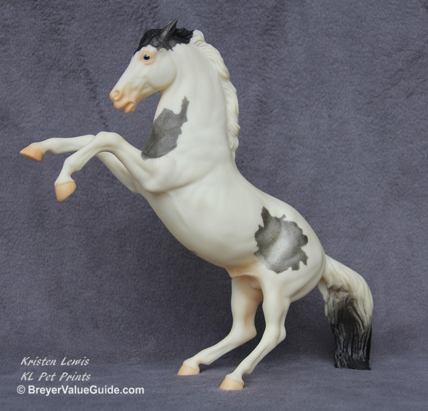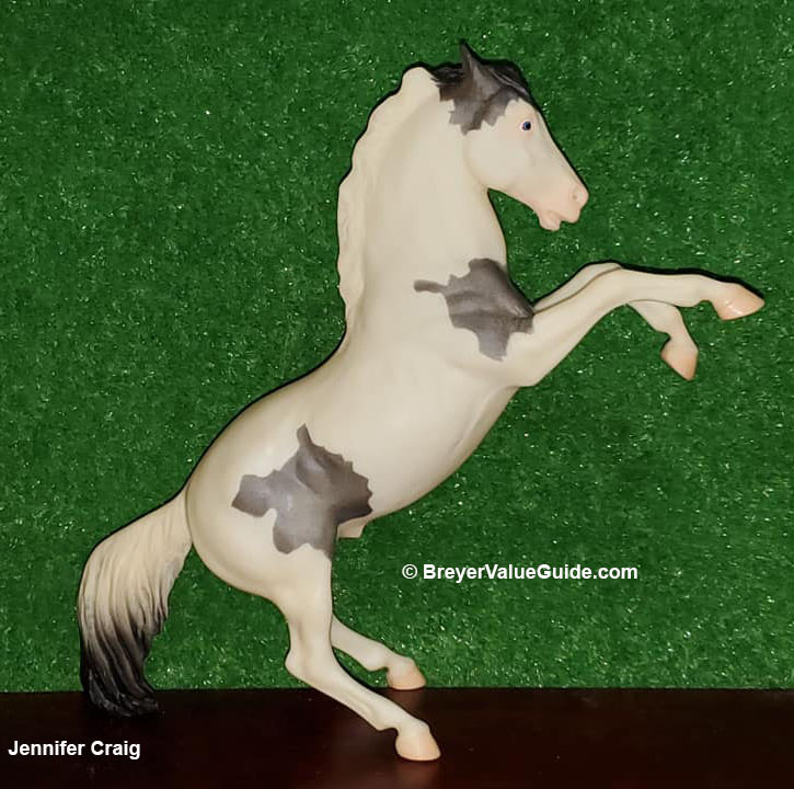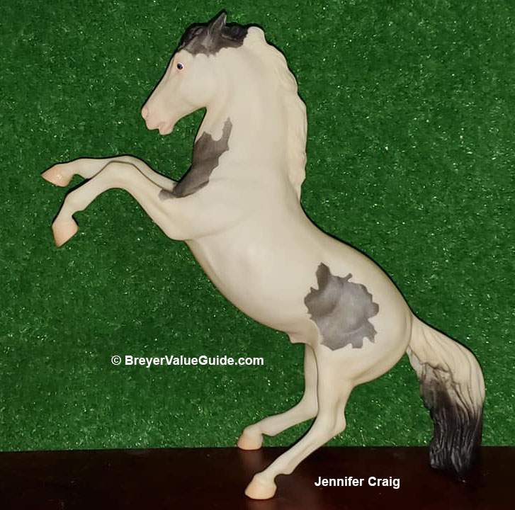 Matte blue roan medicine hat pinto; mostly white; bi-color tail; JCPenney SR – with Mustang