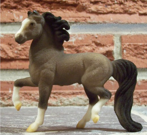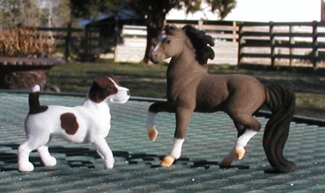 Flocked grey; blaze; darker mane and tail; 4 socks; BreyerFest SR; 1/650 – with flocked Jack Russell dog