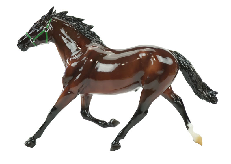 Glossy bay; small star; freeze brand on neck; 1 sock; green halter; “BreyerFest 2018” on belly; BreyerFest SR; 1/750