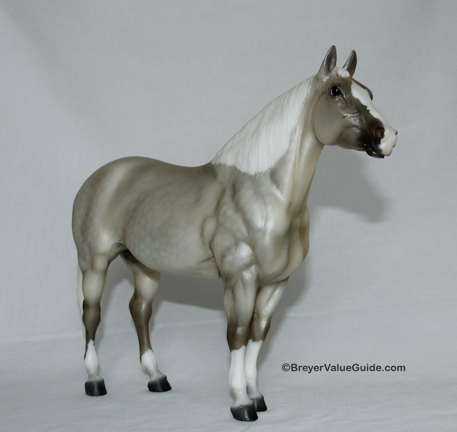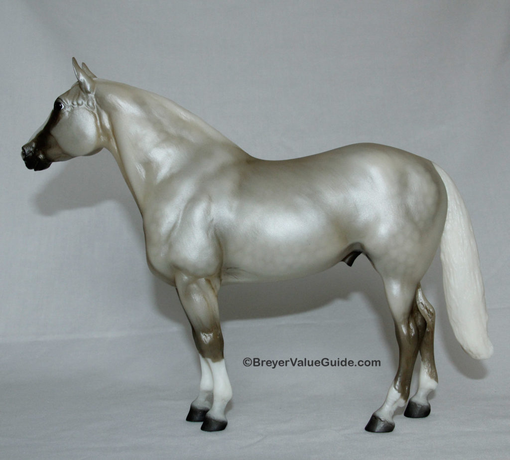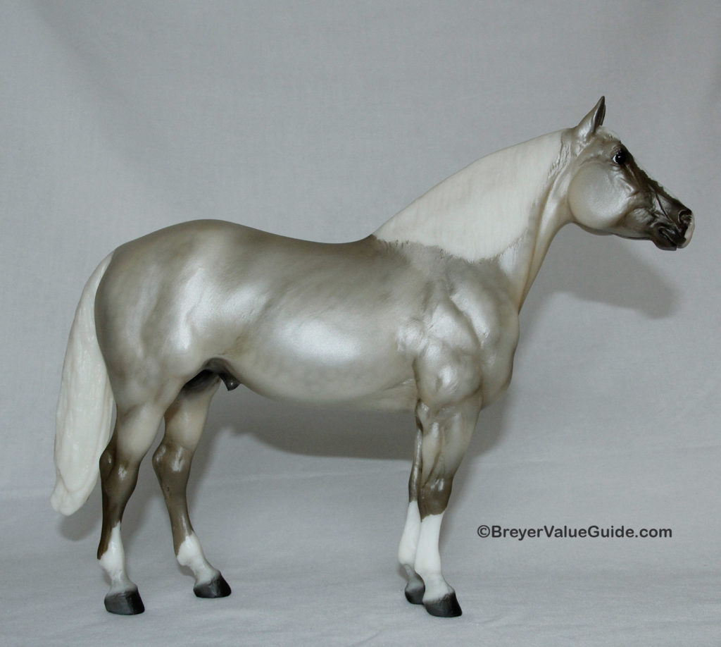 Matte silver dilute dun; slightly metallic; dapples; shaded points, white mane and tail; 4 socks; blaze; Web SR; 1/250