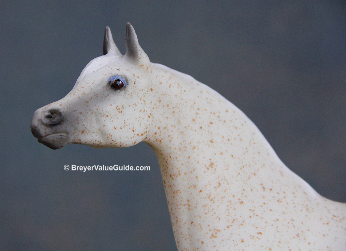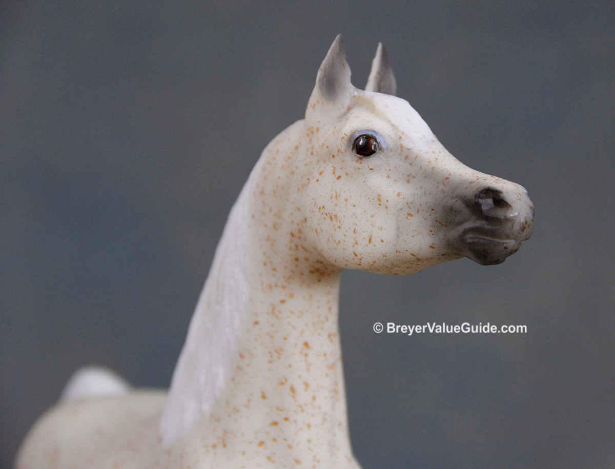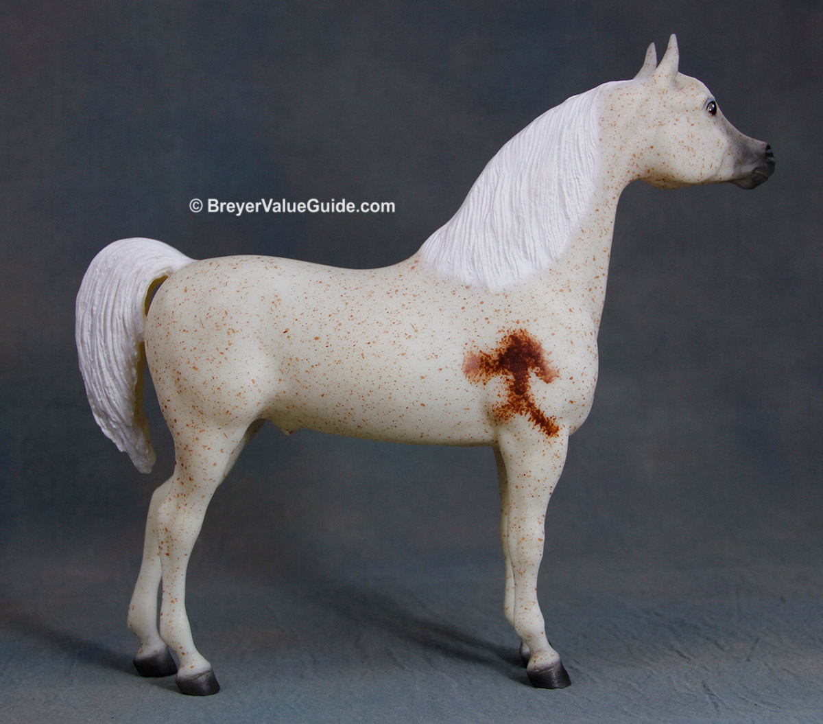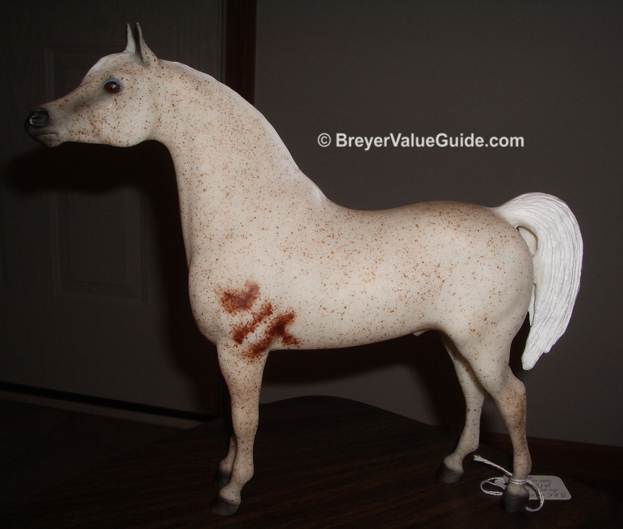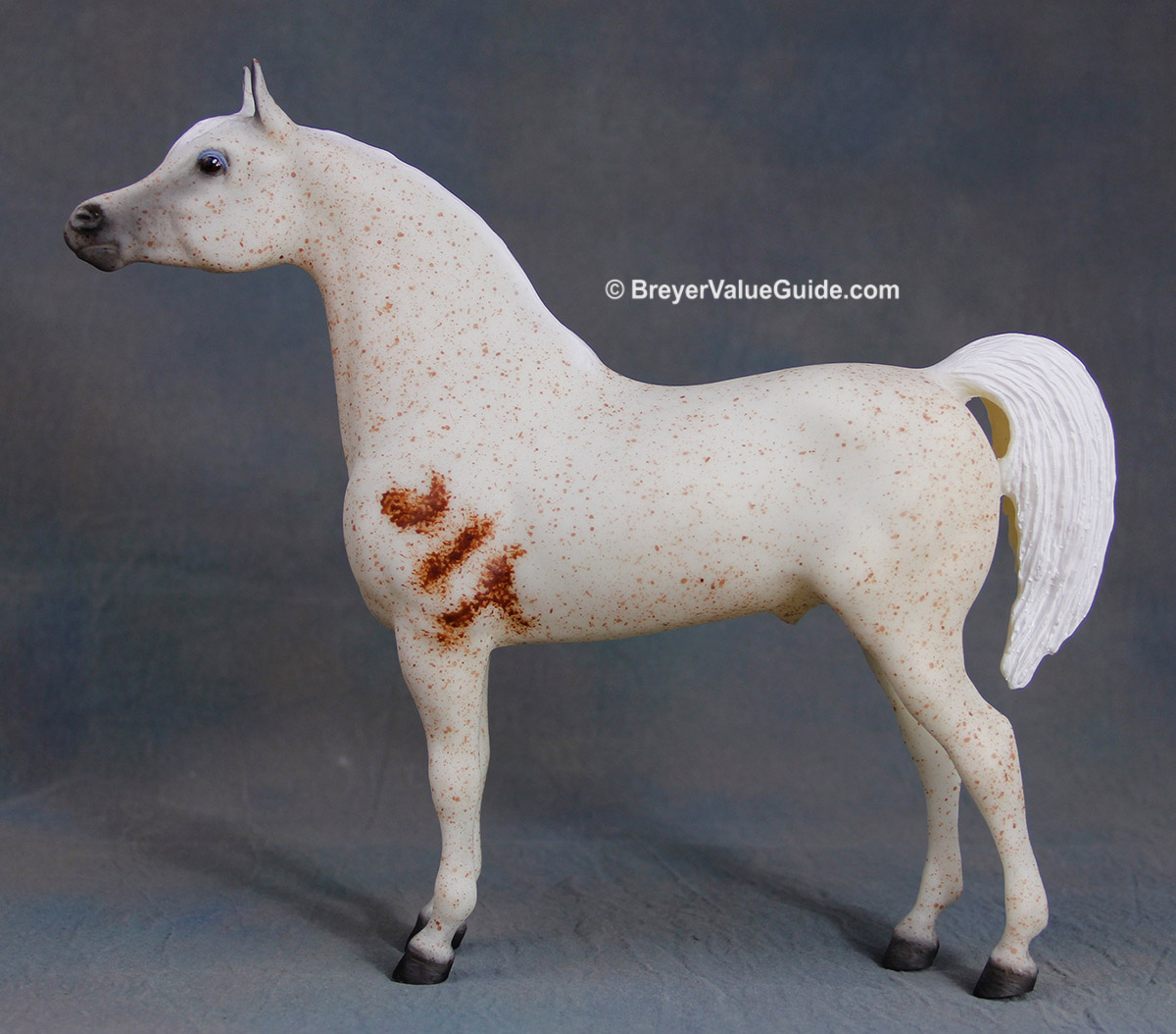 Matte fleabitten grey; mane and tail painted white; red chestnut “bloody shoulder” mark; Commemorative Ed. 1/10;000