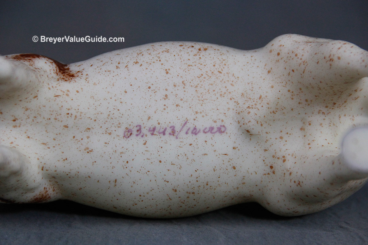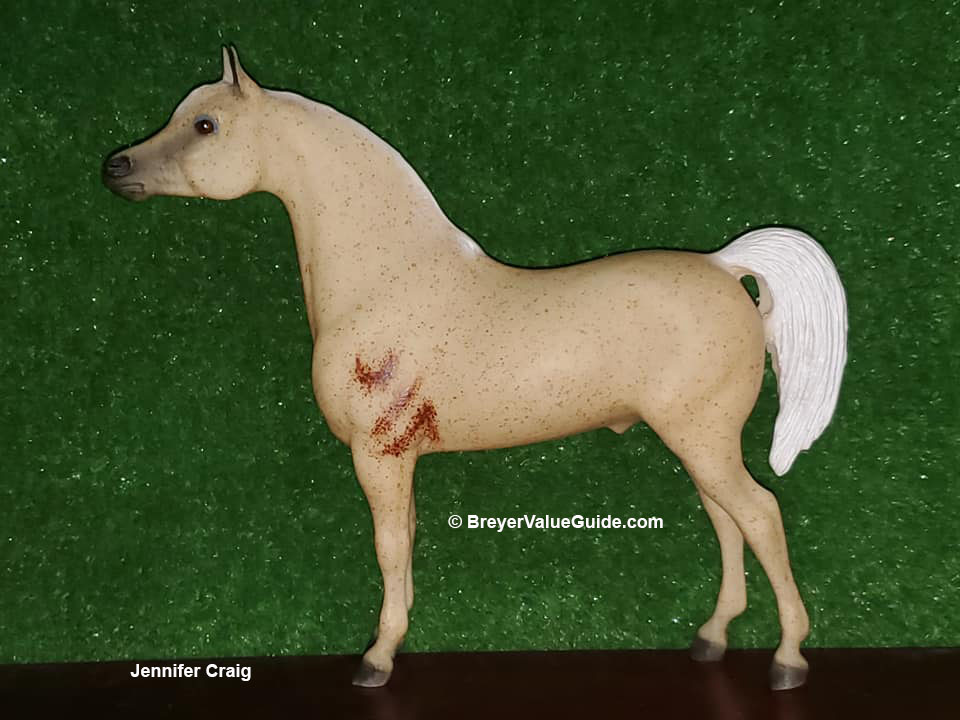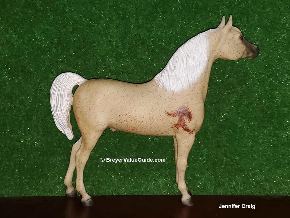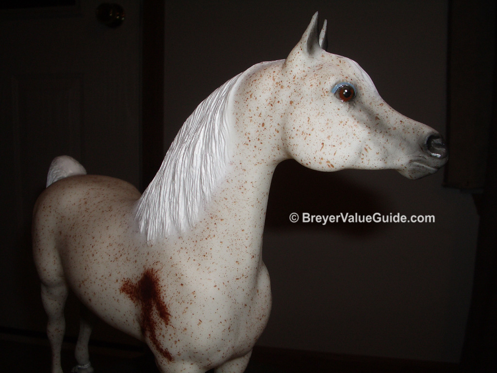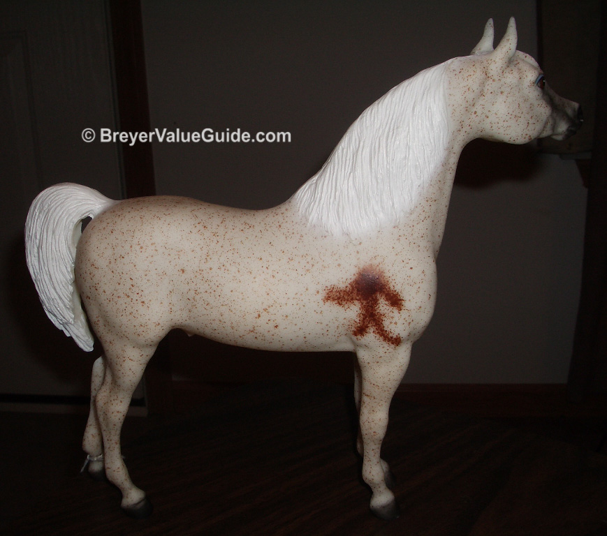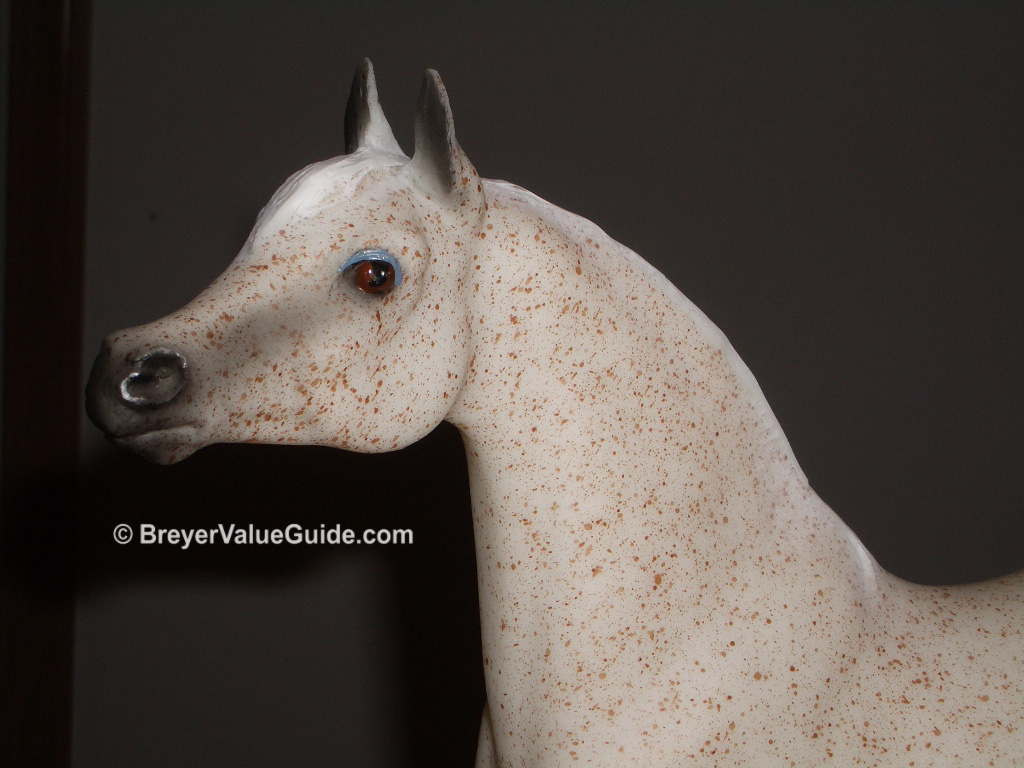 Matte fleabitten grey; mane and tail painted white; red chestnut “bloody shoulder” mark; Commemorative Ed. 1/10;000