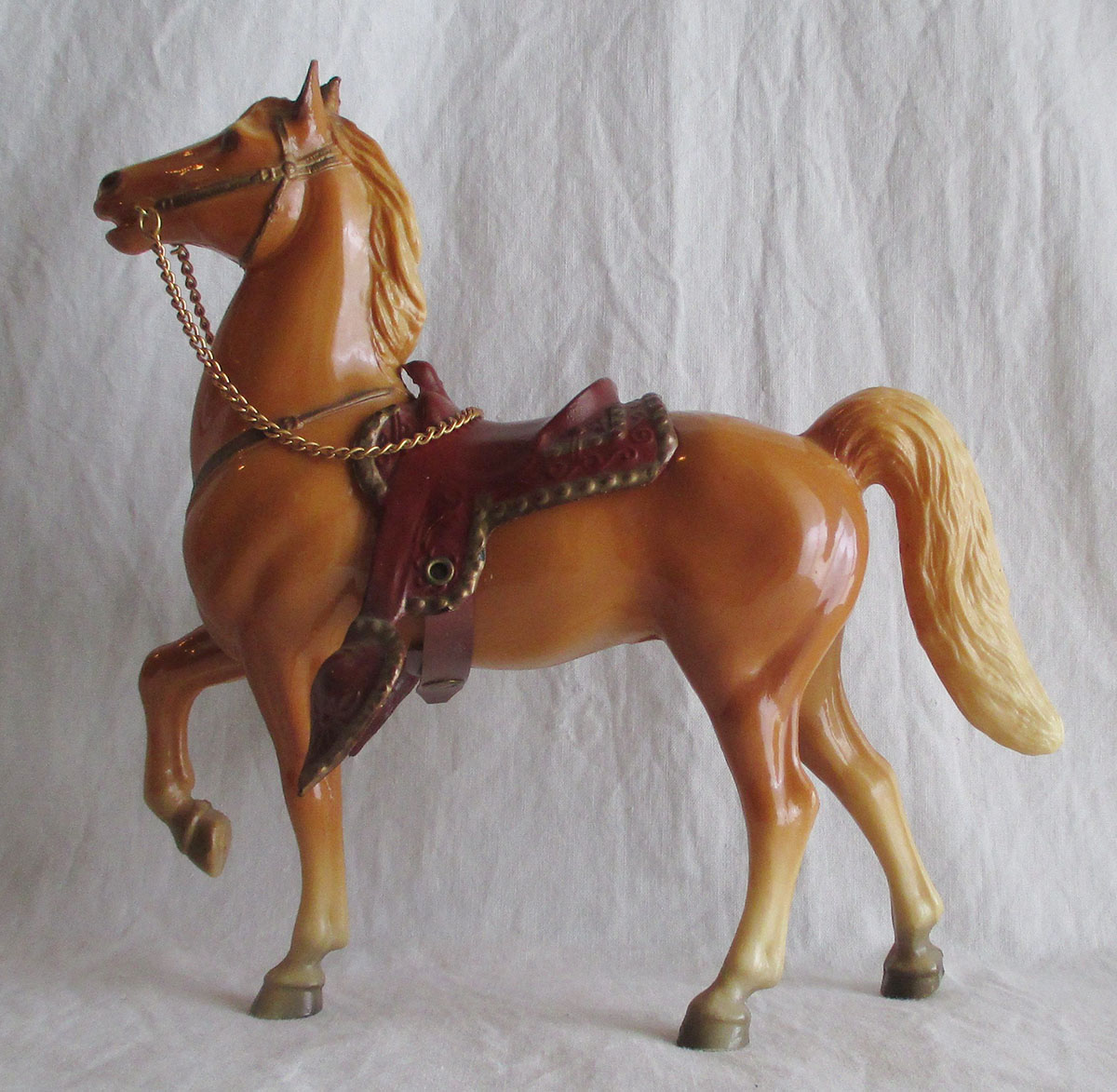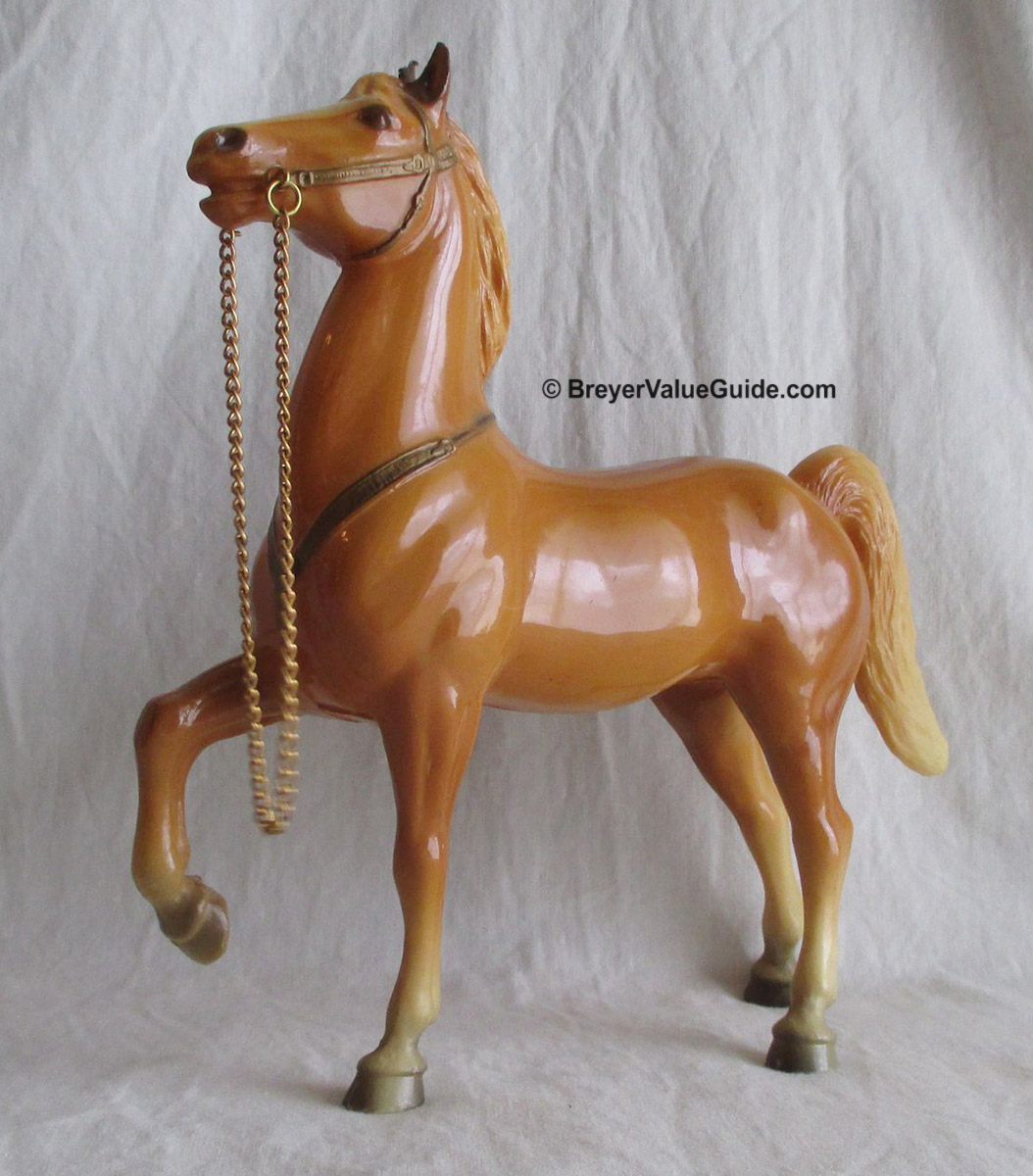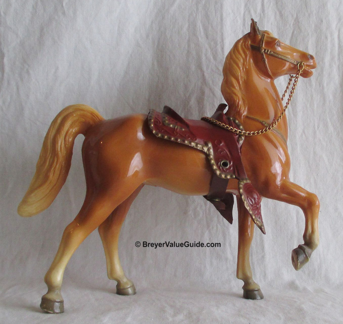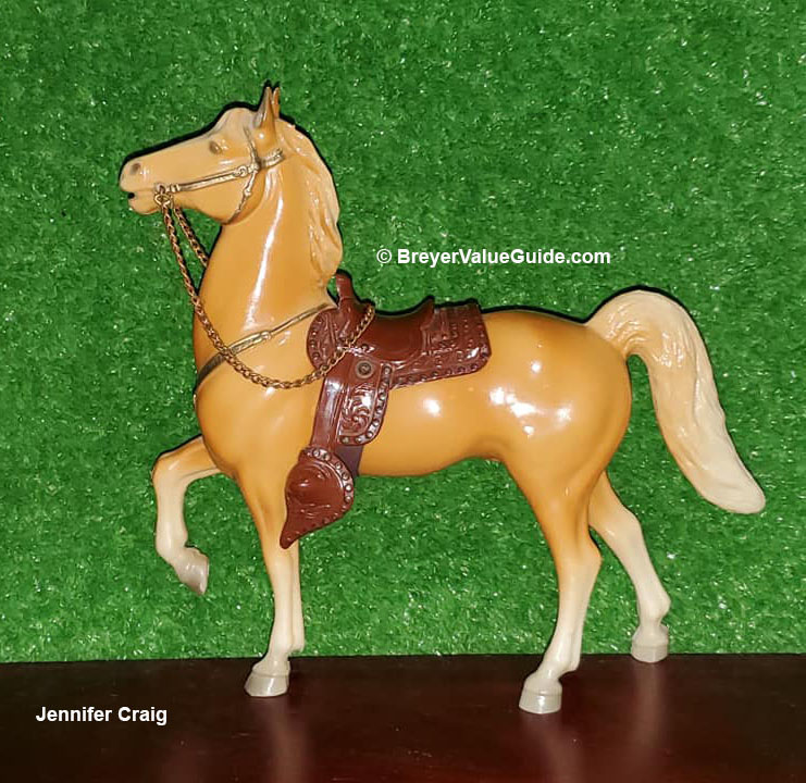 Glossy palomino; bald face; lighter mane and tail; 4 stockings; grey hooves; gold painted on tack; brown Western or brown English saddle