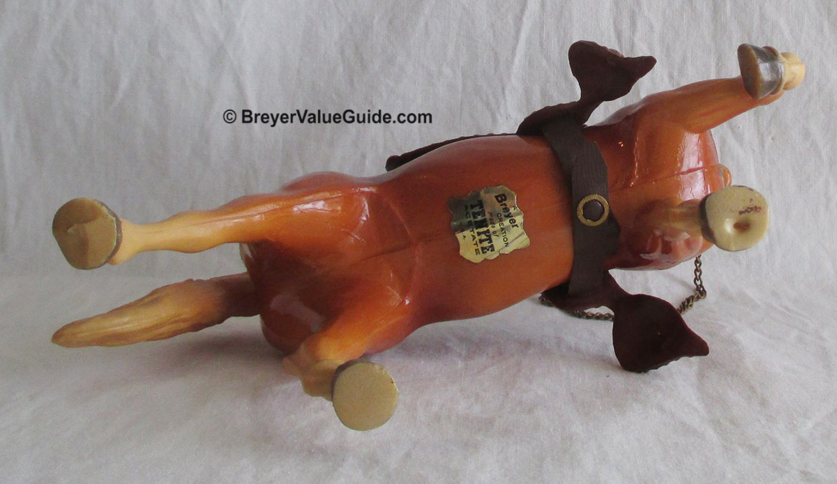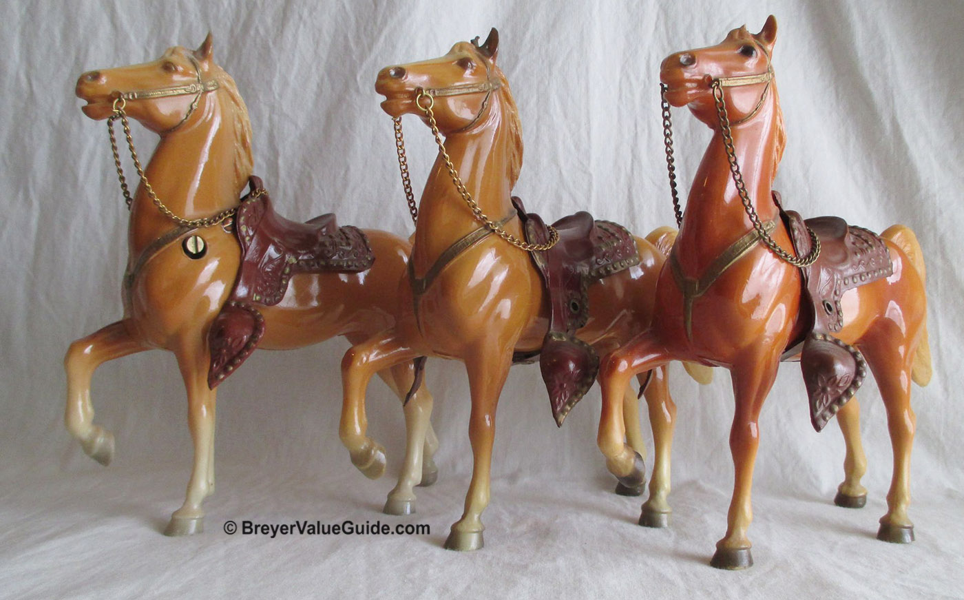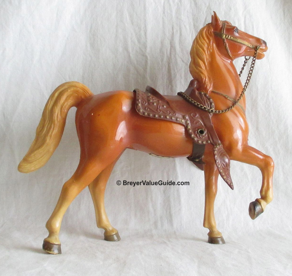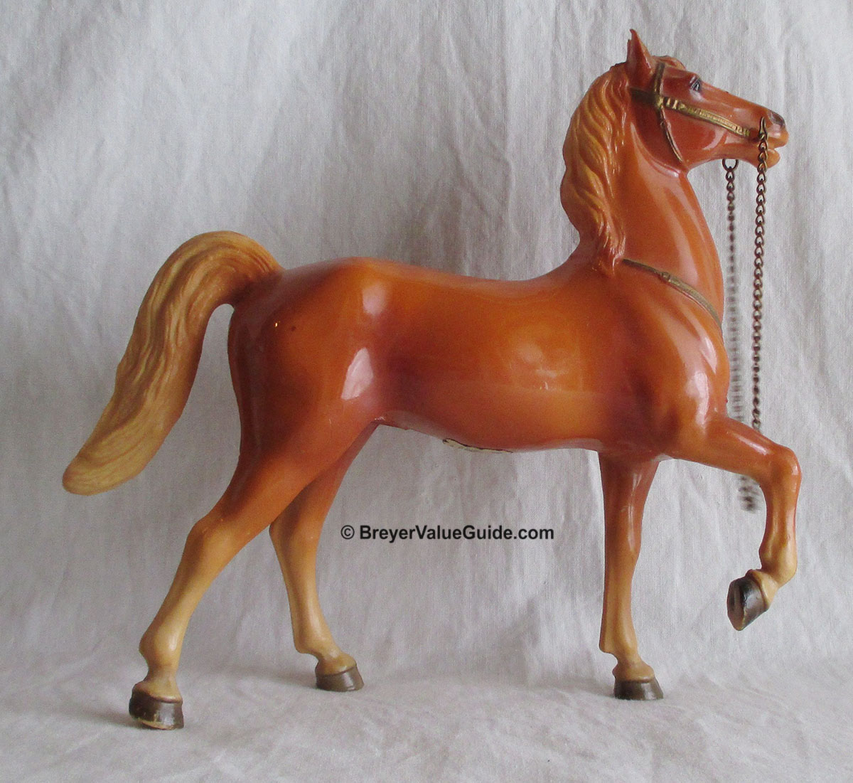 Glossy palomino; bald face; lighter mane and tail; 4 stockings; grey hooves; gold painted on tack; brown Western or brown English saddle