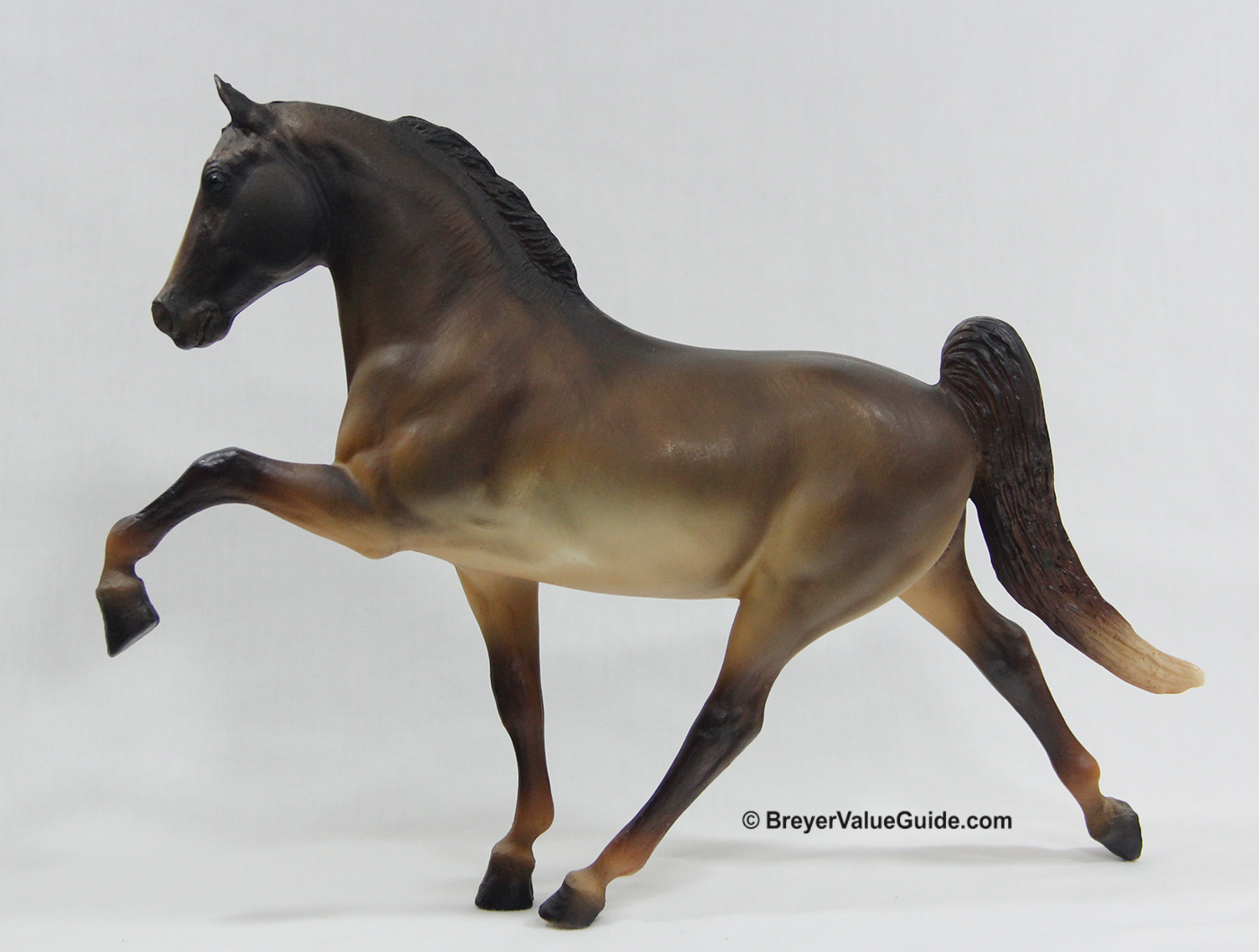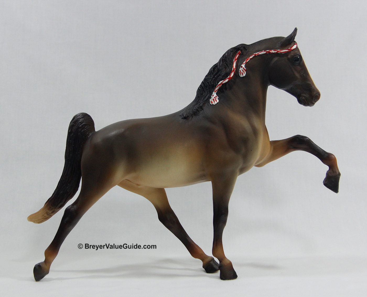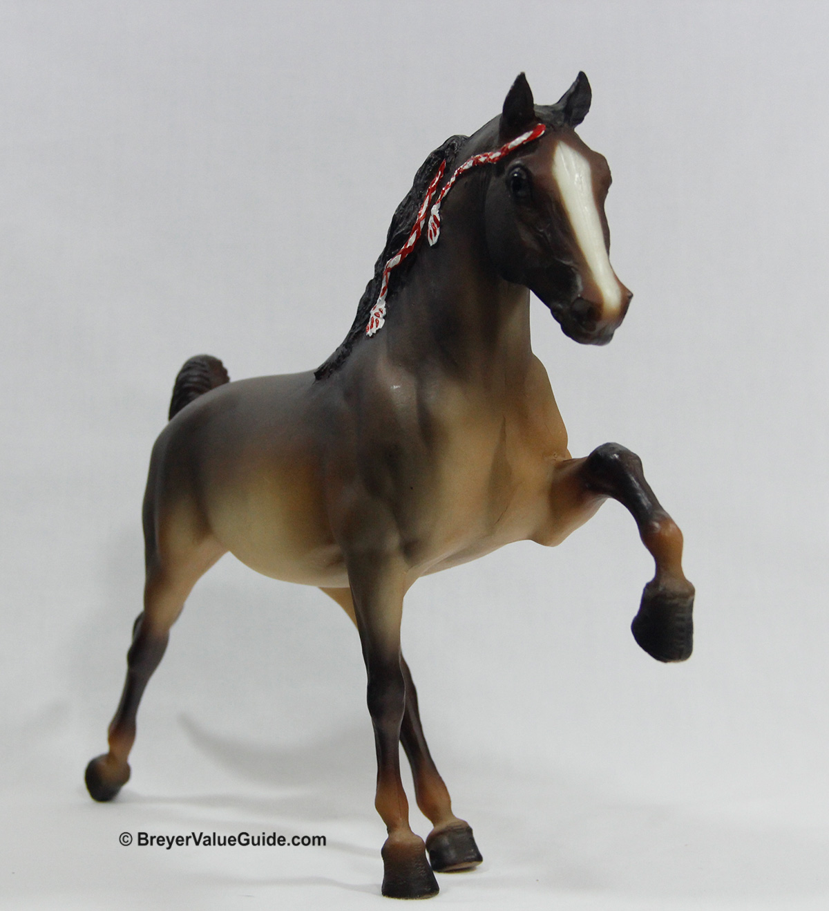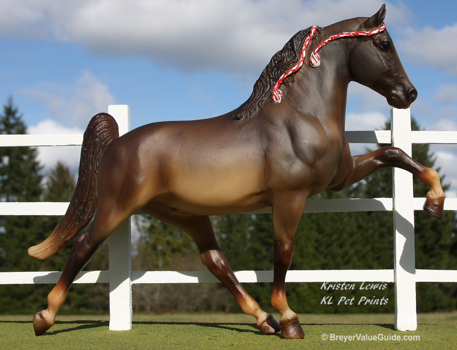 Matte shaded liver chestnut; blaze; red on white ribbons; JCPenney SR – with Five Gaiter; Saddlebred Weanling