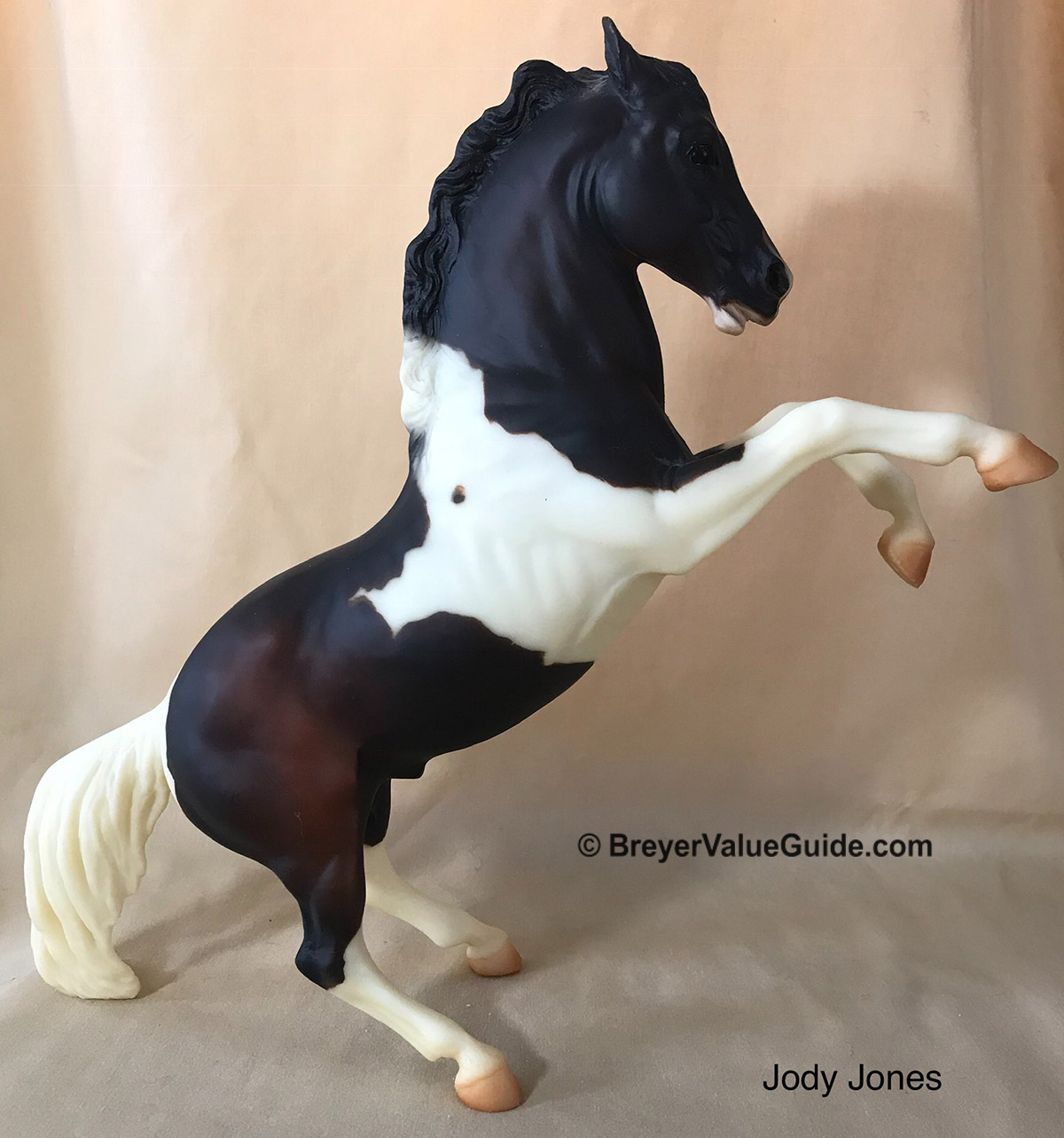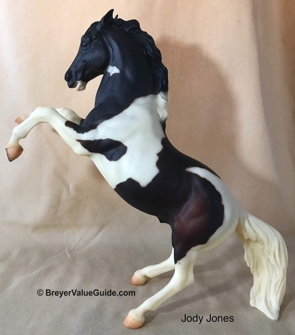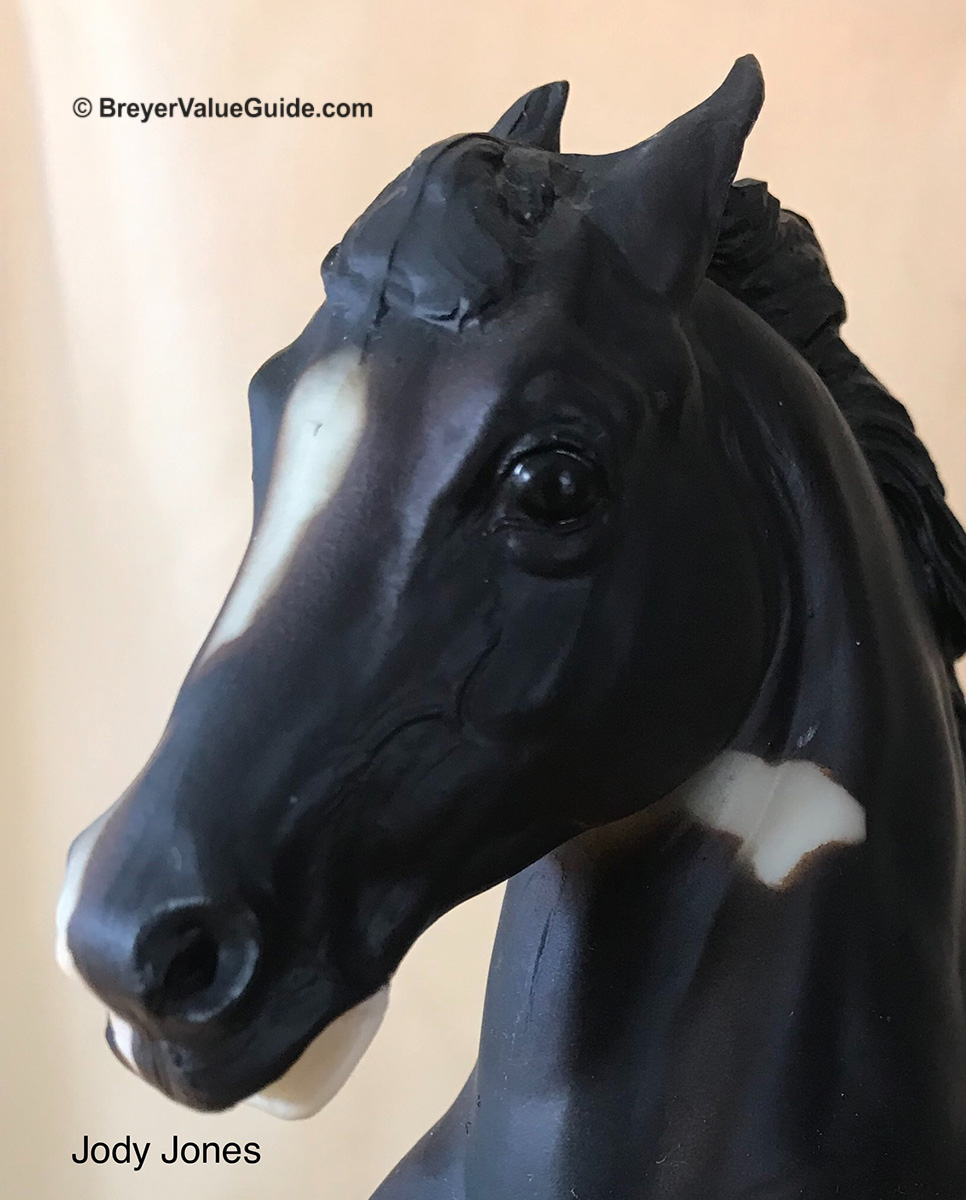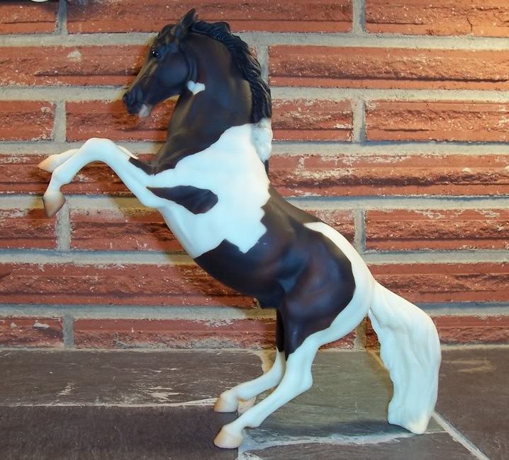 Matte dark bay pinto; white legs; bi-color mane; white tail, broken blaze; chin spot