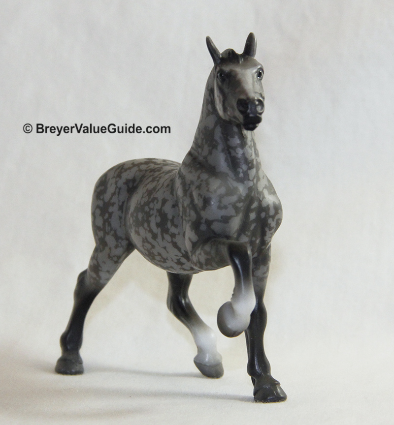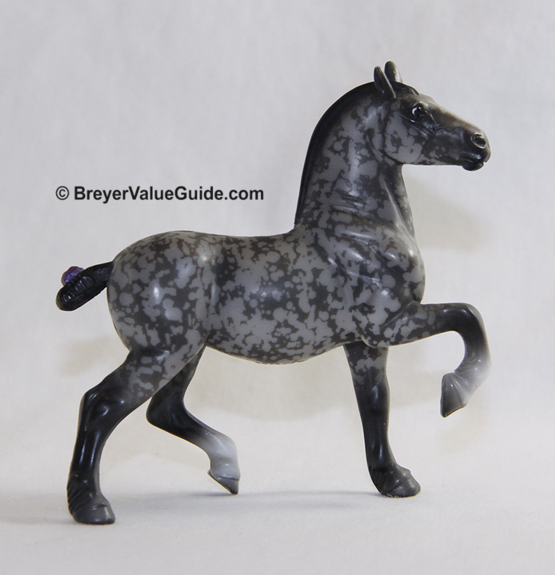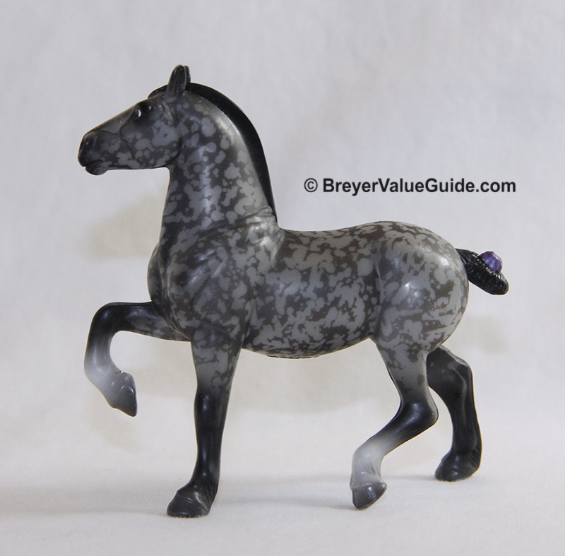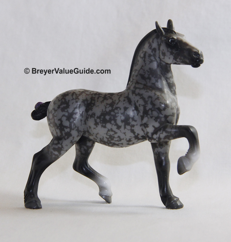 Matte dark resist dappled grey; black mane and tail; 2 socks; purple ribbon