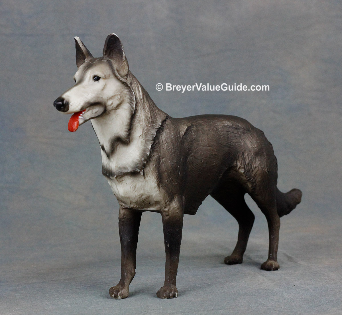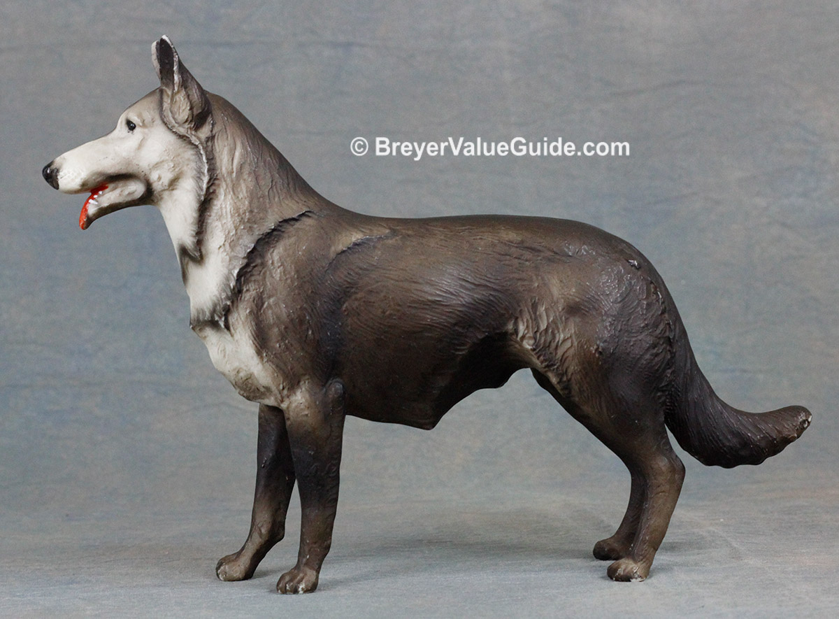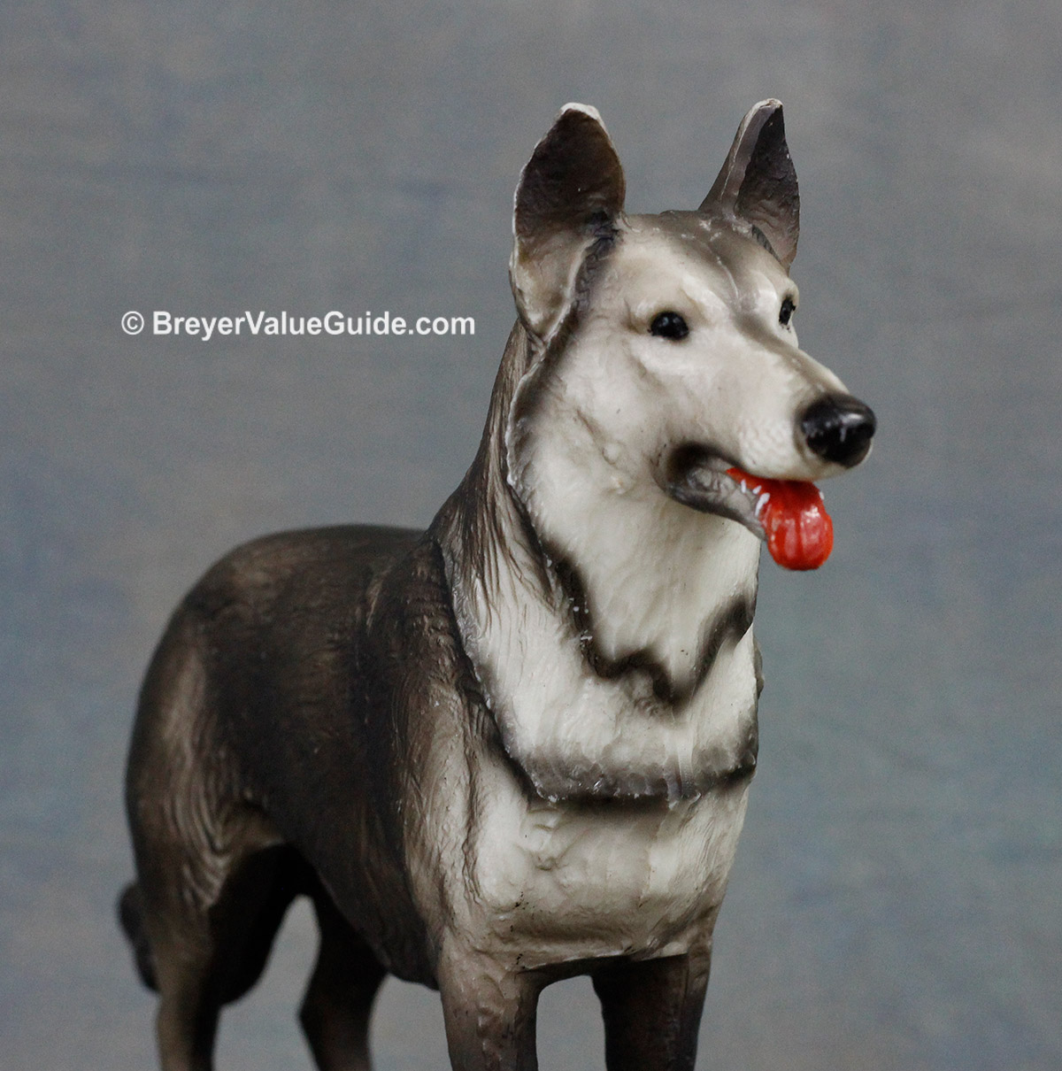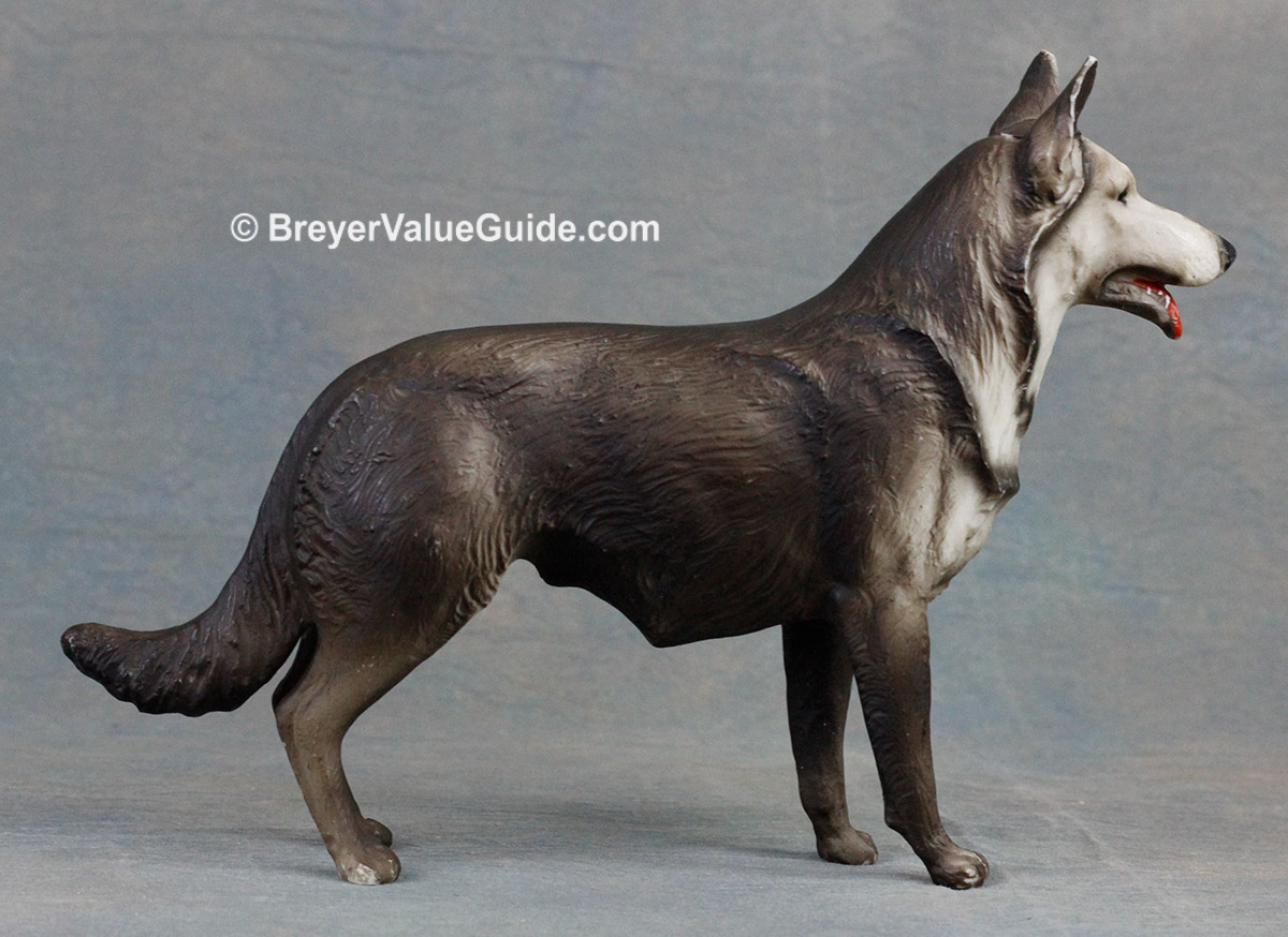 Matte to semigloss grey; light and dark variations known; black nose; red tongue
