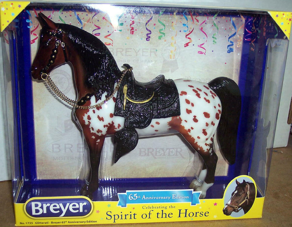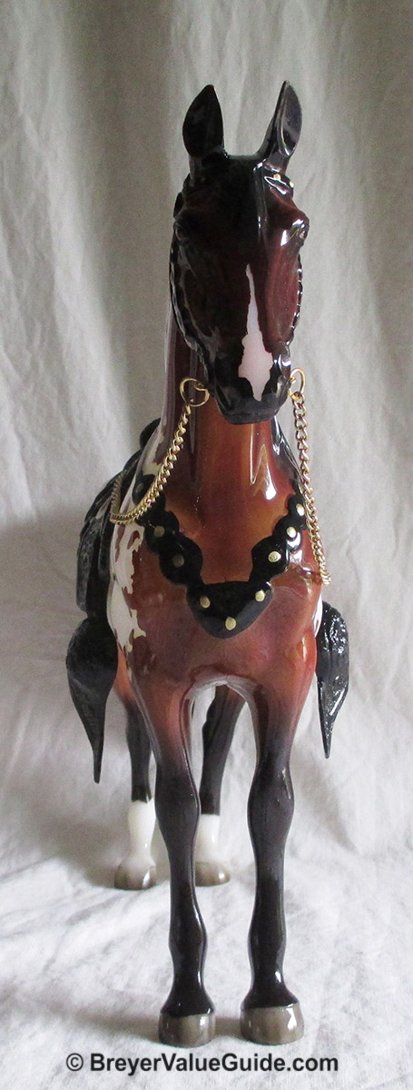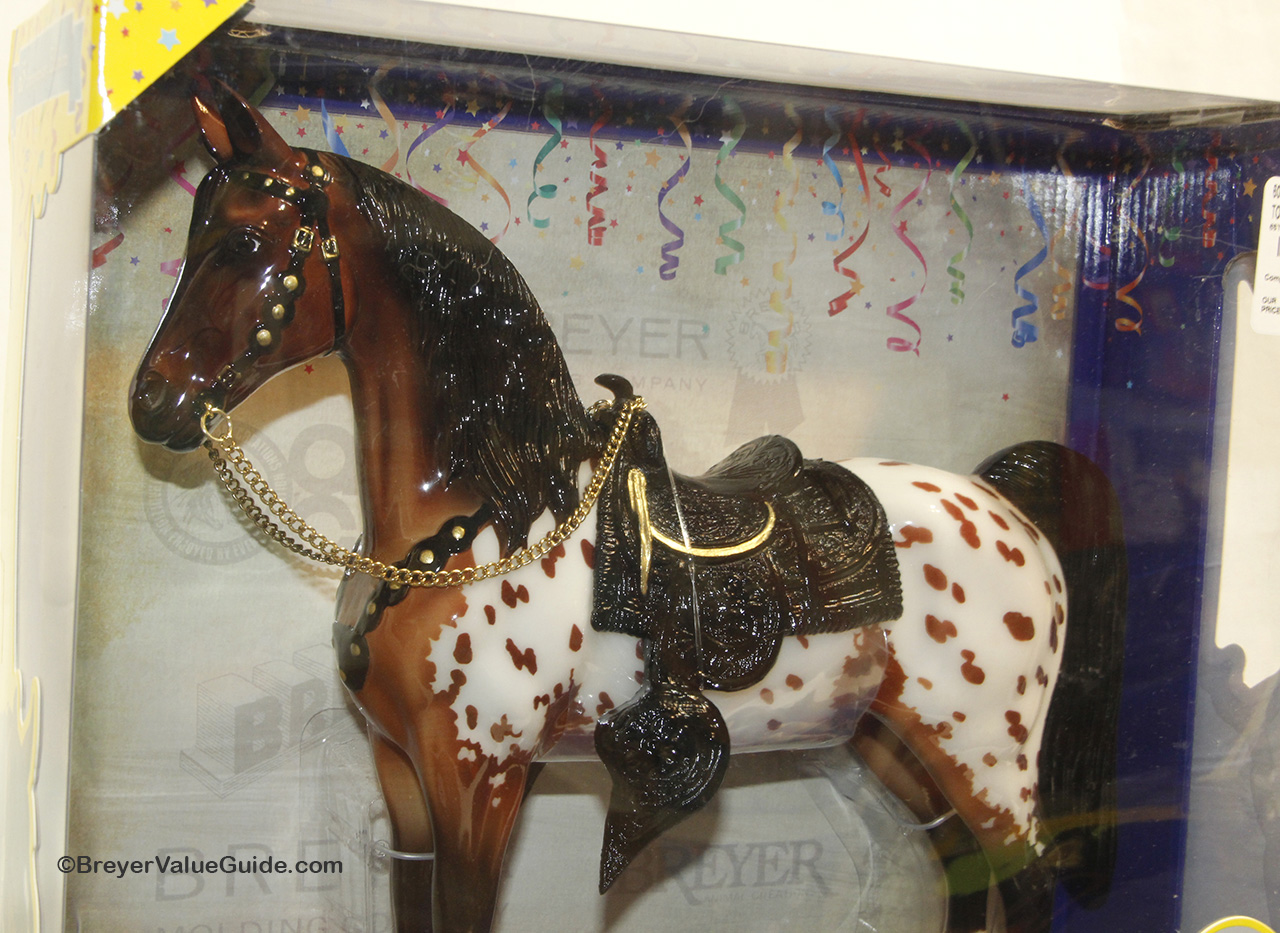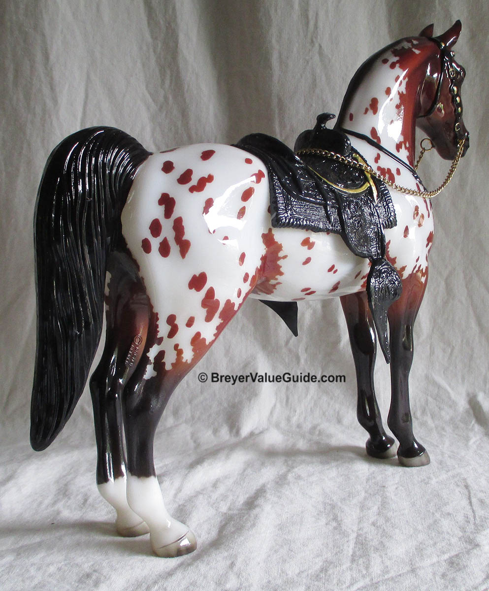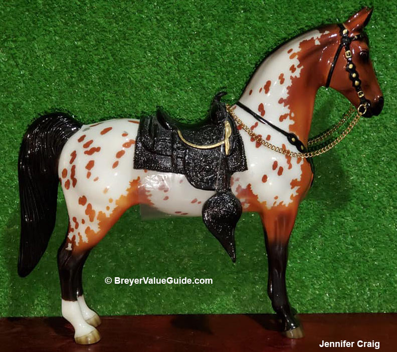 Glossy bay semi-leopard appaloosa; large snip; stenciled markings; 2 hind socks; black with gold bridle; harness and saddle