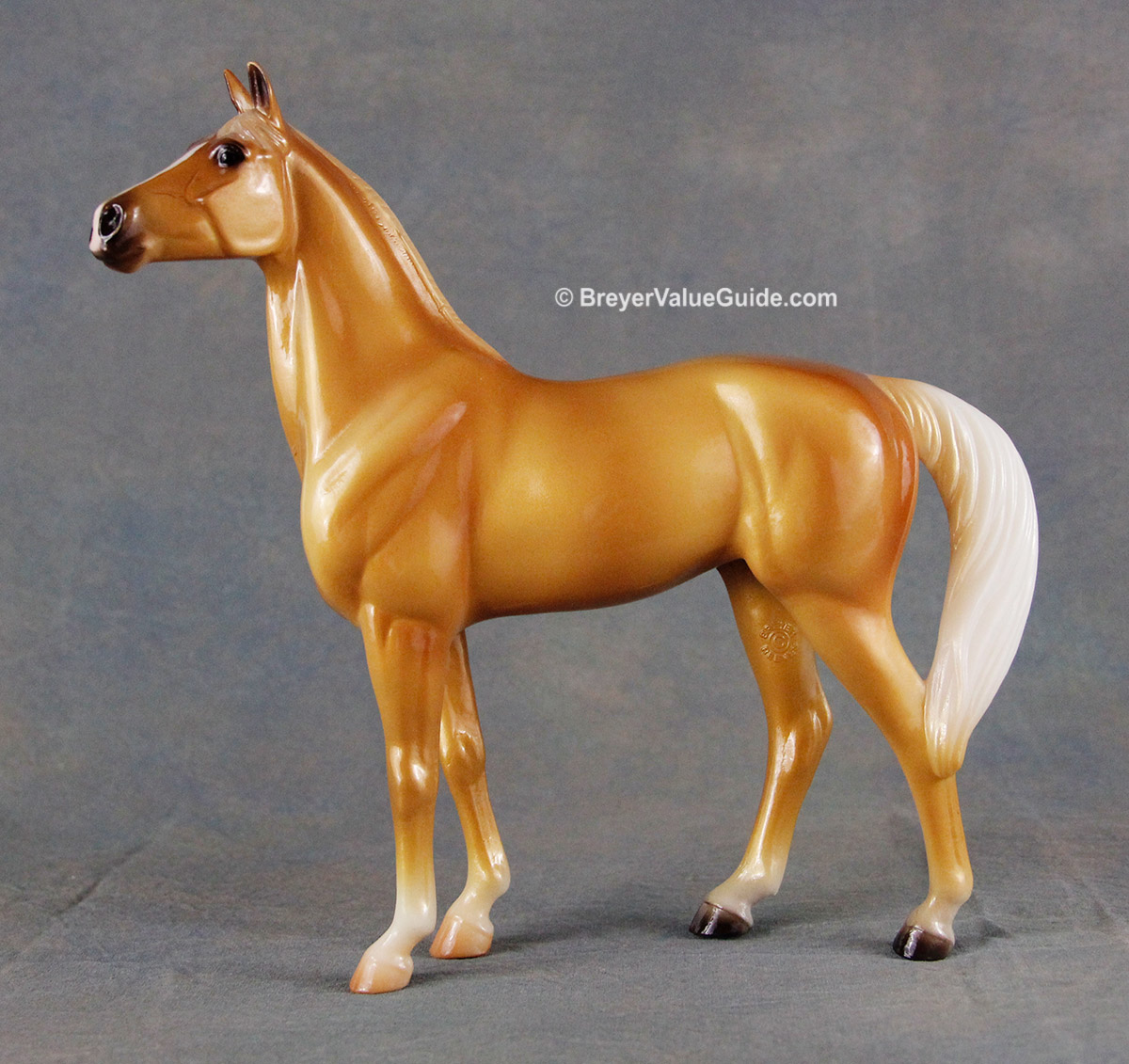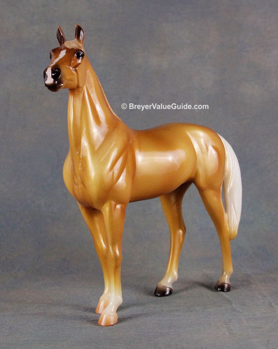 Glossy metallic palomino; blaze-snip; low socks; front natural hooves; back grey hooves; Live Show Kids Prize SR