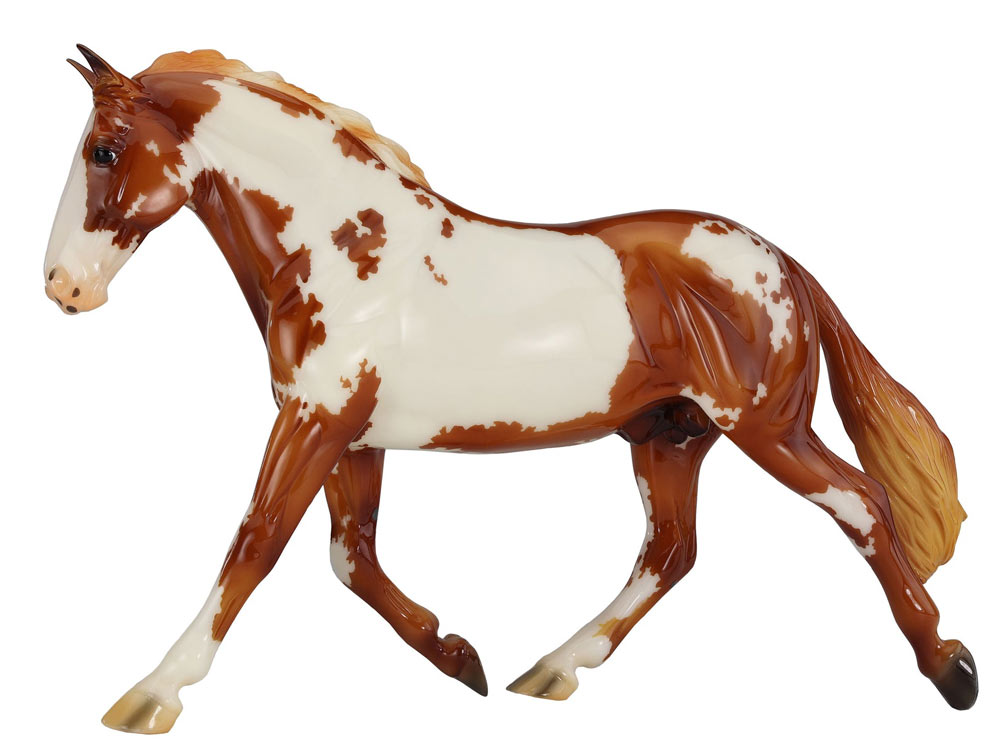 Glossy chestnut pinto, stenciled bald face, 2 socks, Breyer MidWest 2026 SR Issue price: $185 Value TBD