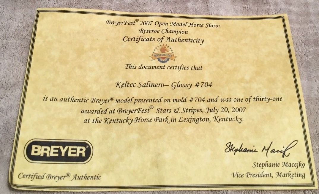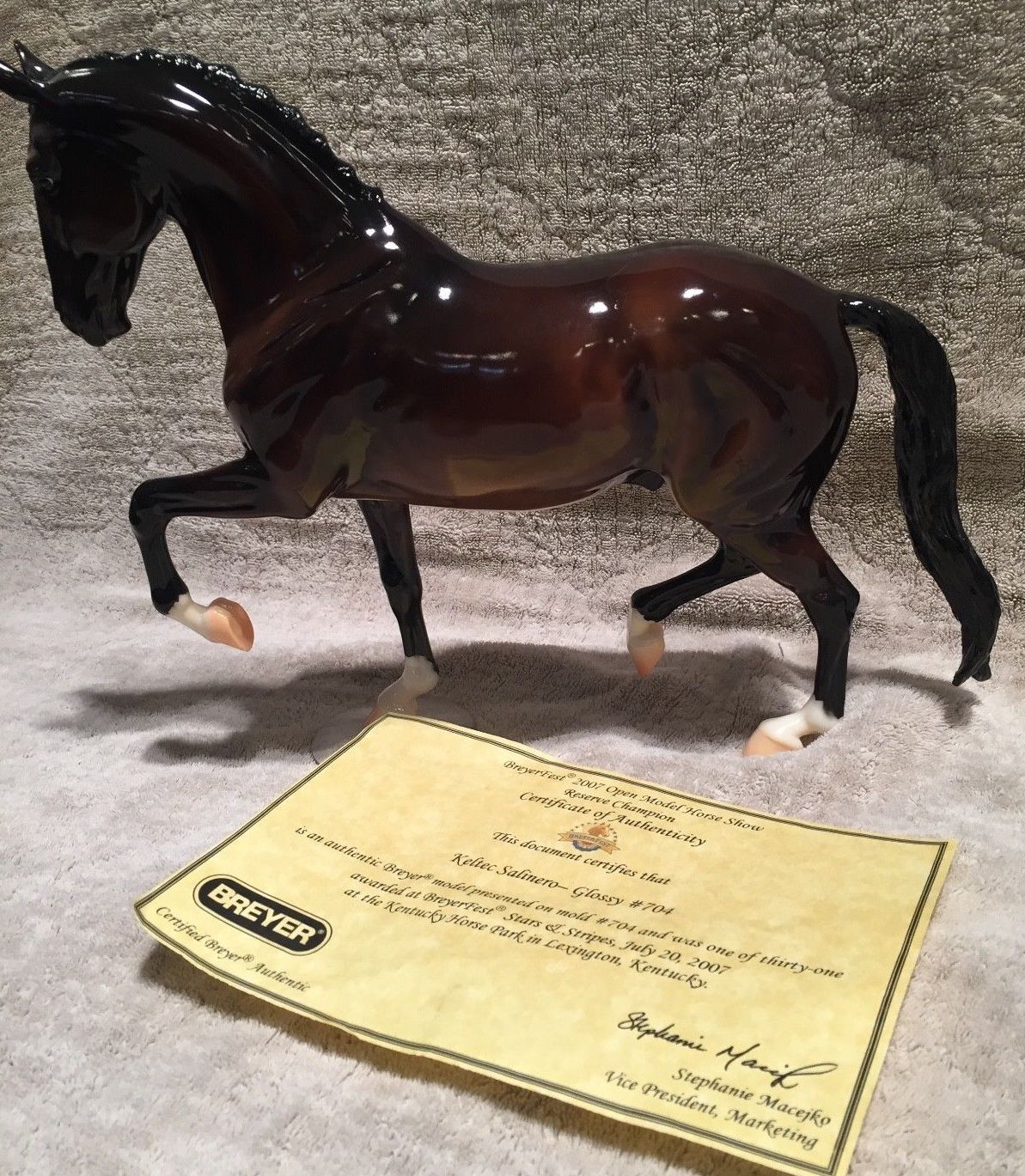 Glossy bay; star; snip; 4 socks “Anky van Grunseven” signature on belly; BreyerFest Prize SR; 1/31