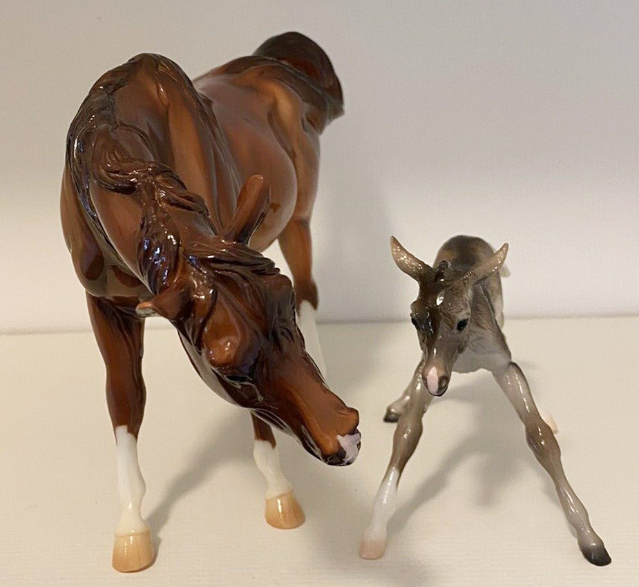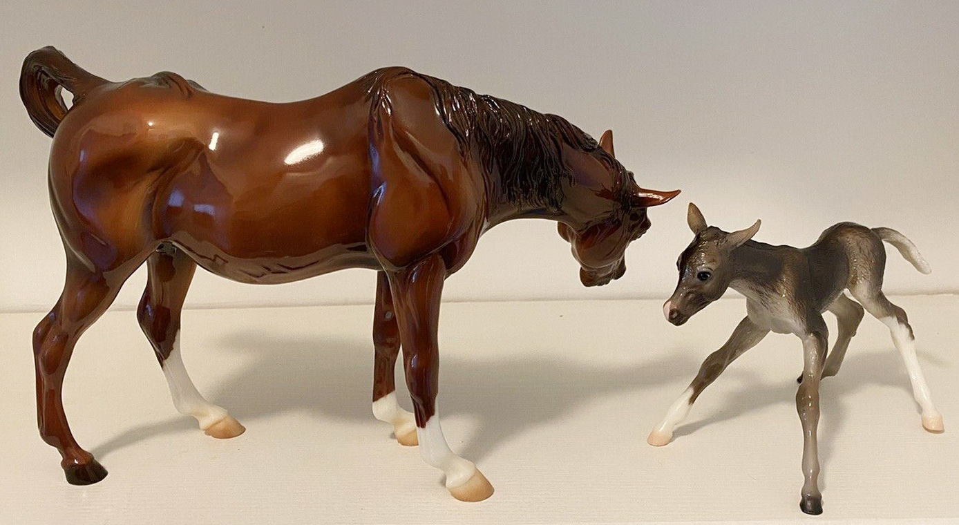 Mare: Glossy shaded red chestnut; snip; 3 socks Foal: Glossy shaded grey, snip, front sock, hind stocking BreyerWest 2008 Raffle SR Valued as set. Value based on 2021 auction sold price.