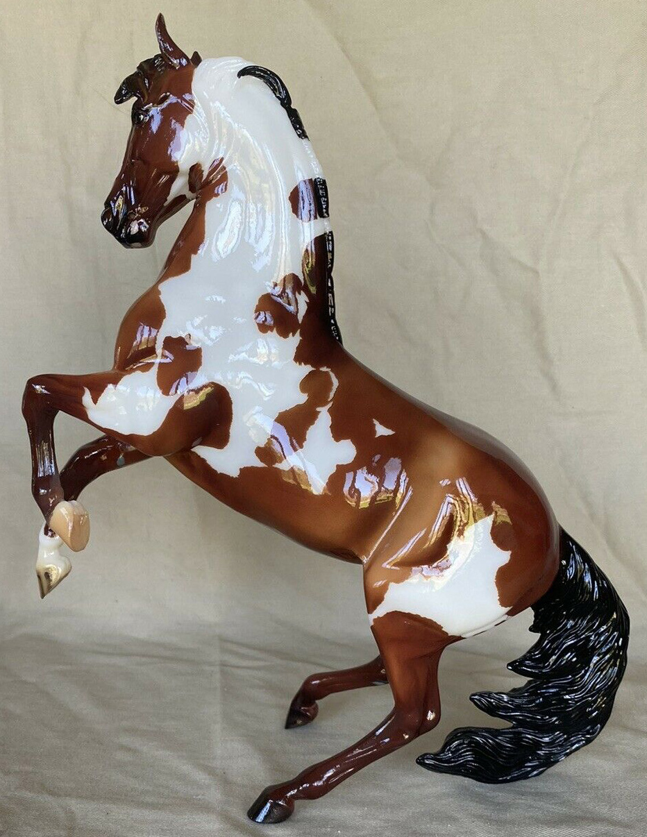 Glossy bay pinto; wide blaze; 1 front sock with striped hoof; BreyerFest Prize SR; 1/50