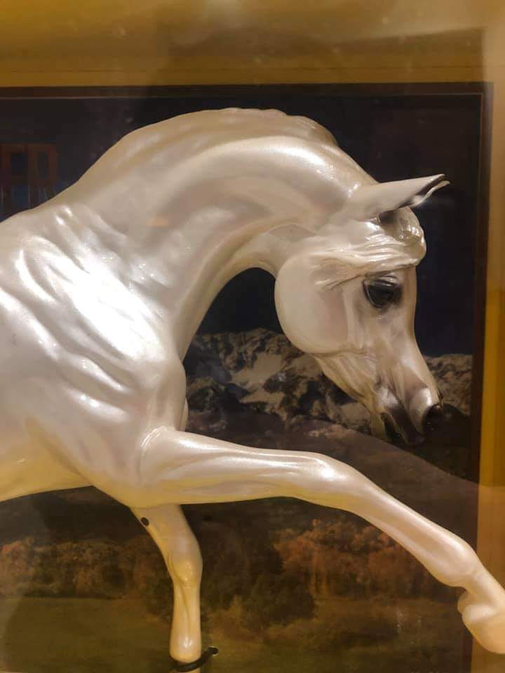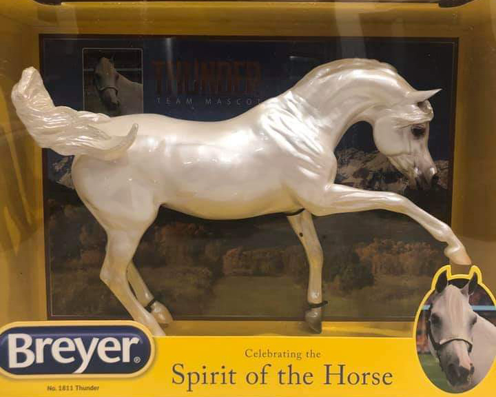 Glossy pearly white, dark grey shaded muzzle, 3 natural hooves, 1 grey hoof, Denver Broncos Team Mascot; Collector Club Appreciation SR, about 157 produced