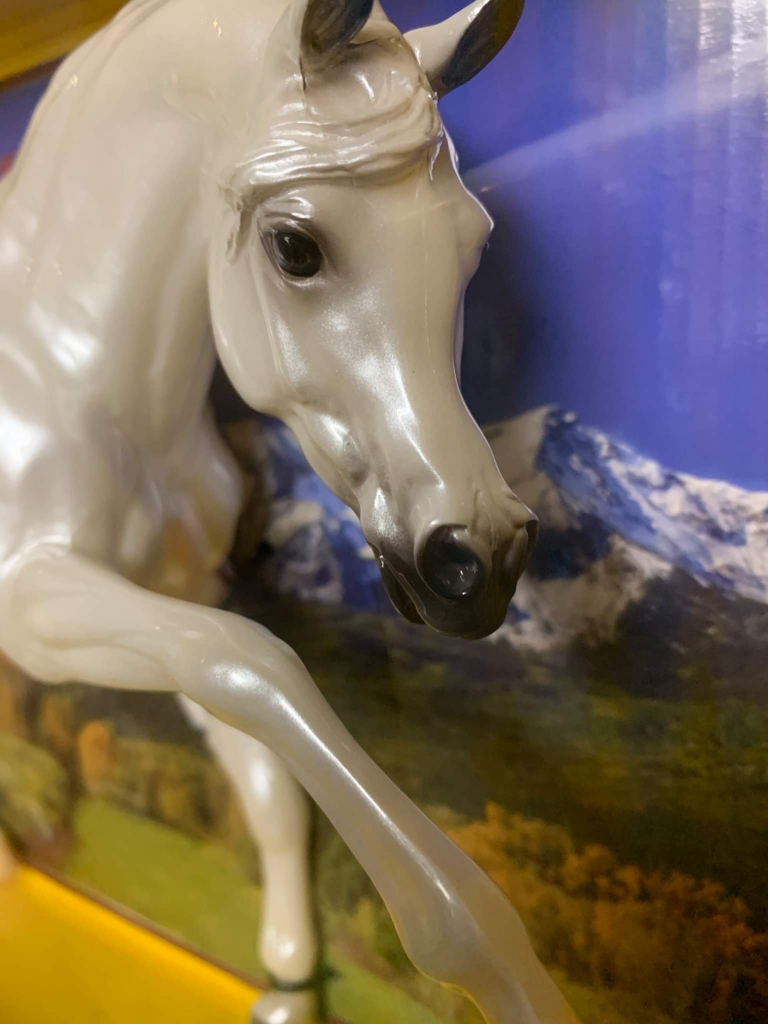 Glossy pearly white, dark grey shaded muzzle, 3 natural hooves, 1 grey hoof, Denver Broncos Team Mascot; Collector Club Appreciation SR, about 157 produced
