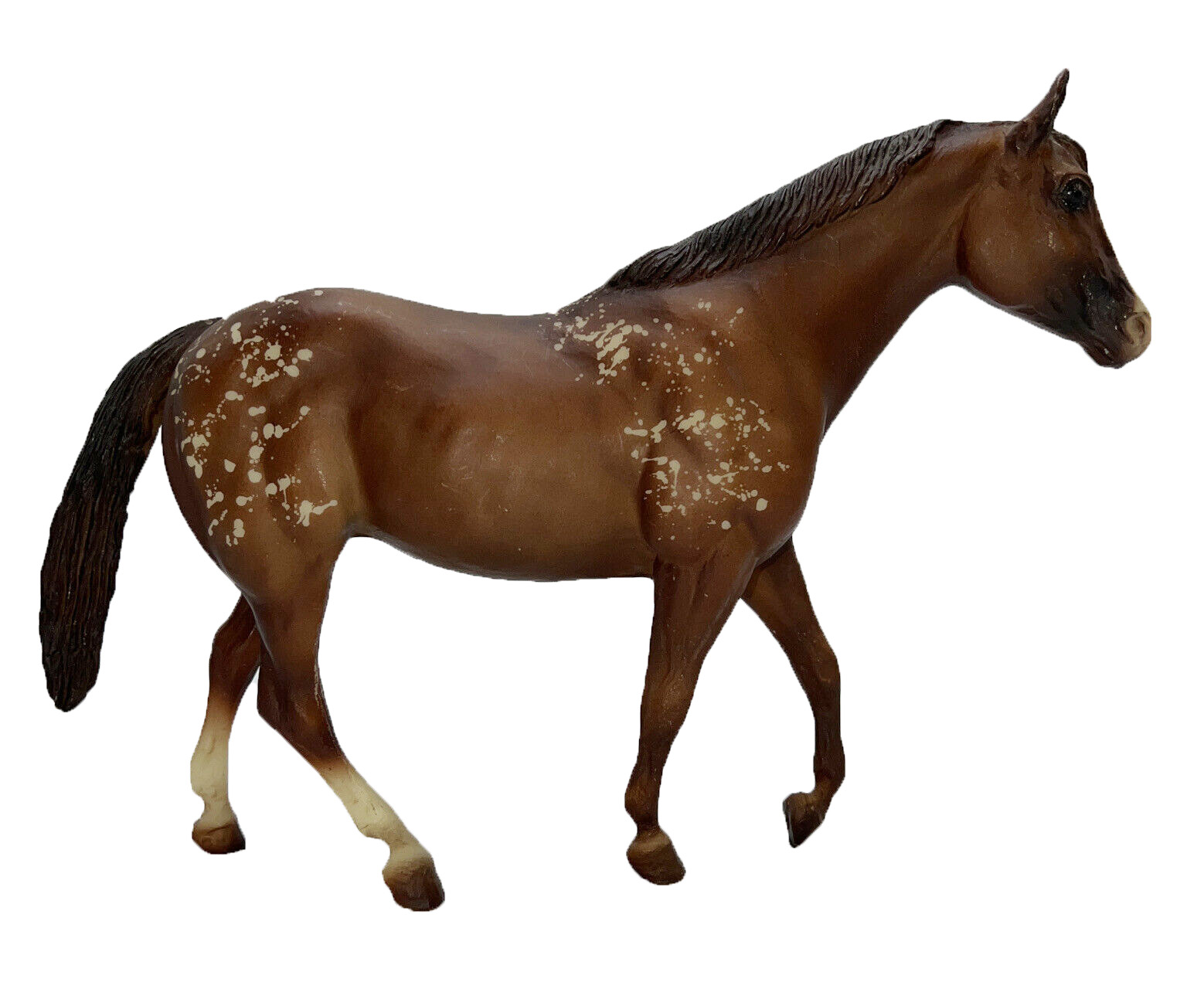 Matte chestnut snowflake appaloosa; resist spots on haunches and shoulders; blaze; hind socks