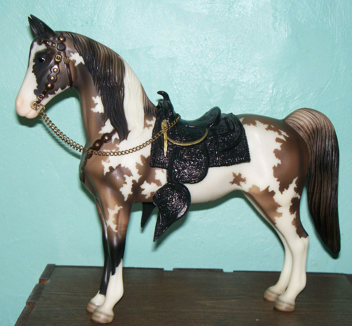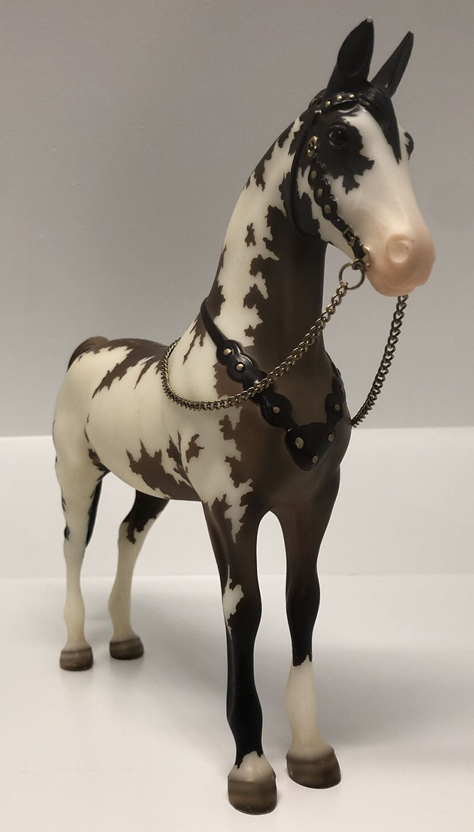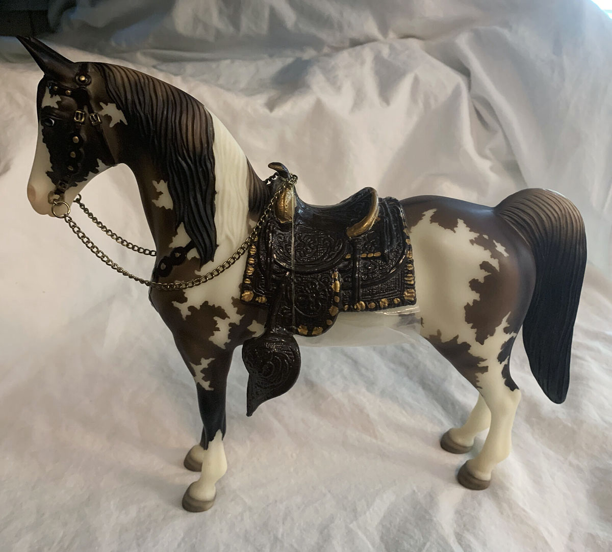 Matte grullo pinto; detailed markings; white face; black with gold bridle; harness and saddle; “BreyerFest 2014” stamp; BreyerFest SR; 1/575