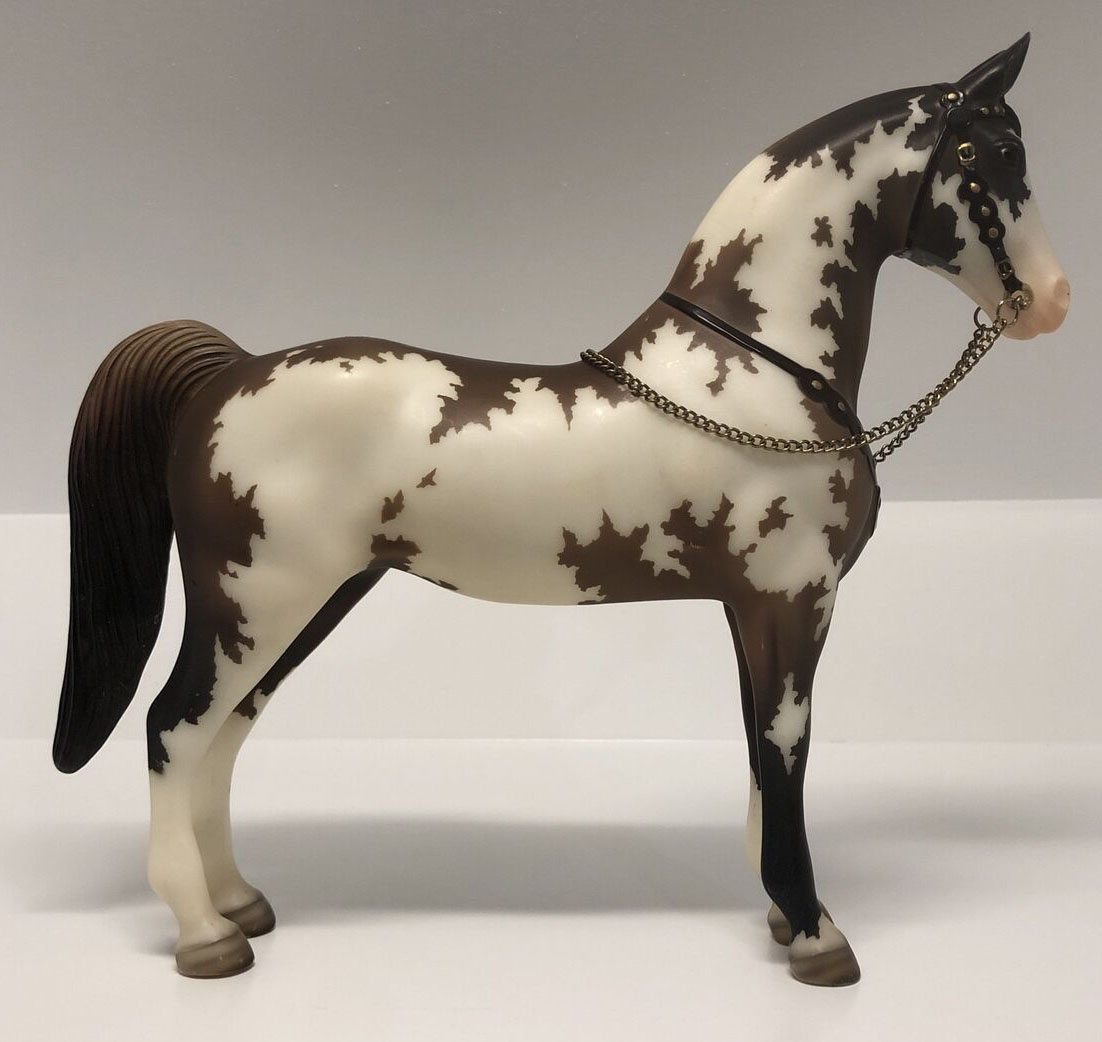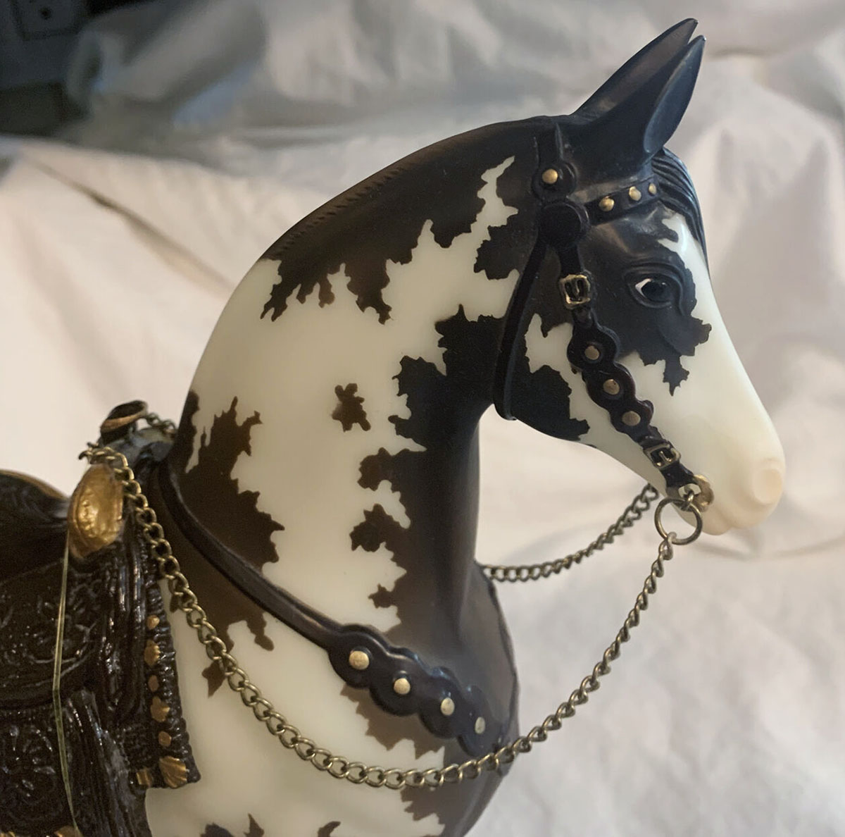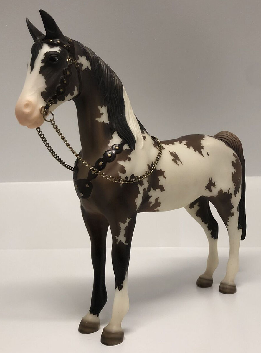 Matte grullo pinto; detailed markings; white face; black with gold bridle; harness and saddle; “BreyerFest 2014” stamp; BreyerFest SR; 1/575