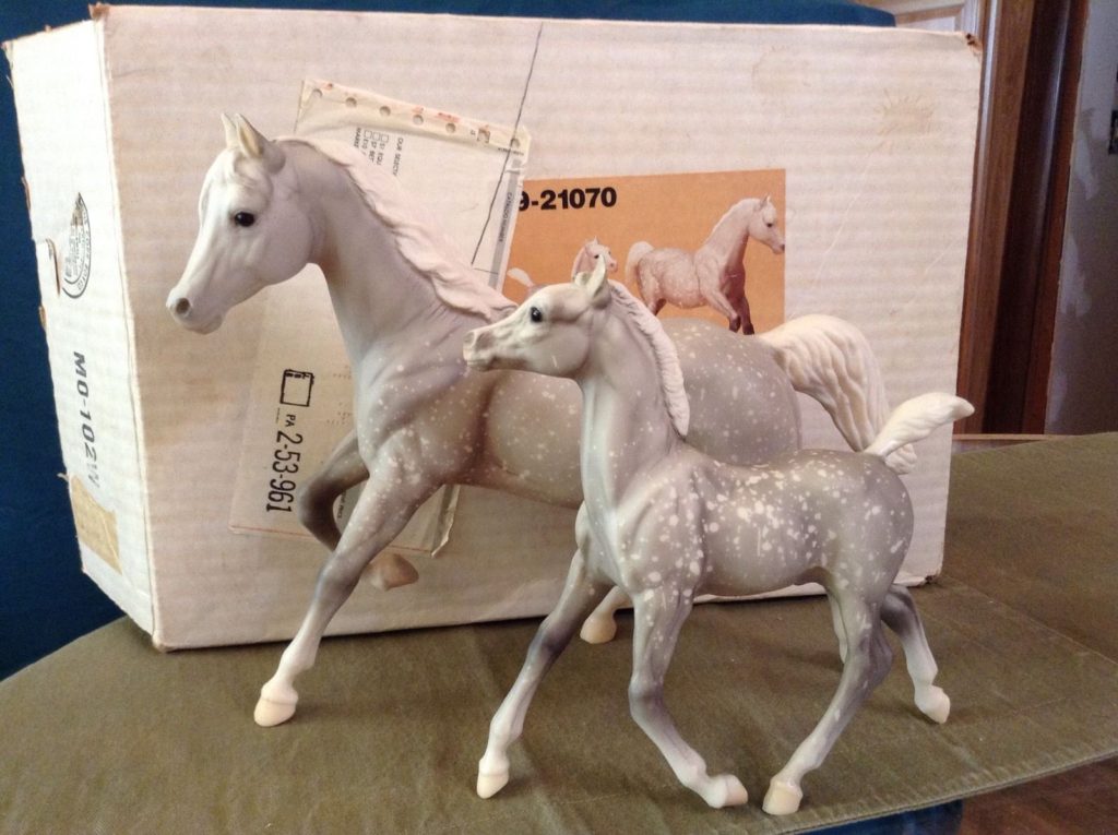 Matte light dapple grey; bald face; white mane and tail; 4 socks; Sears SR – with Running Foal