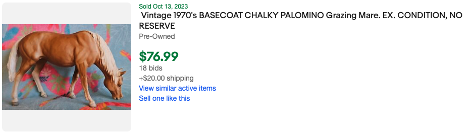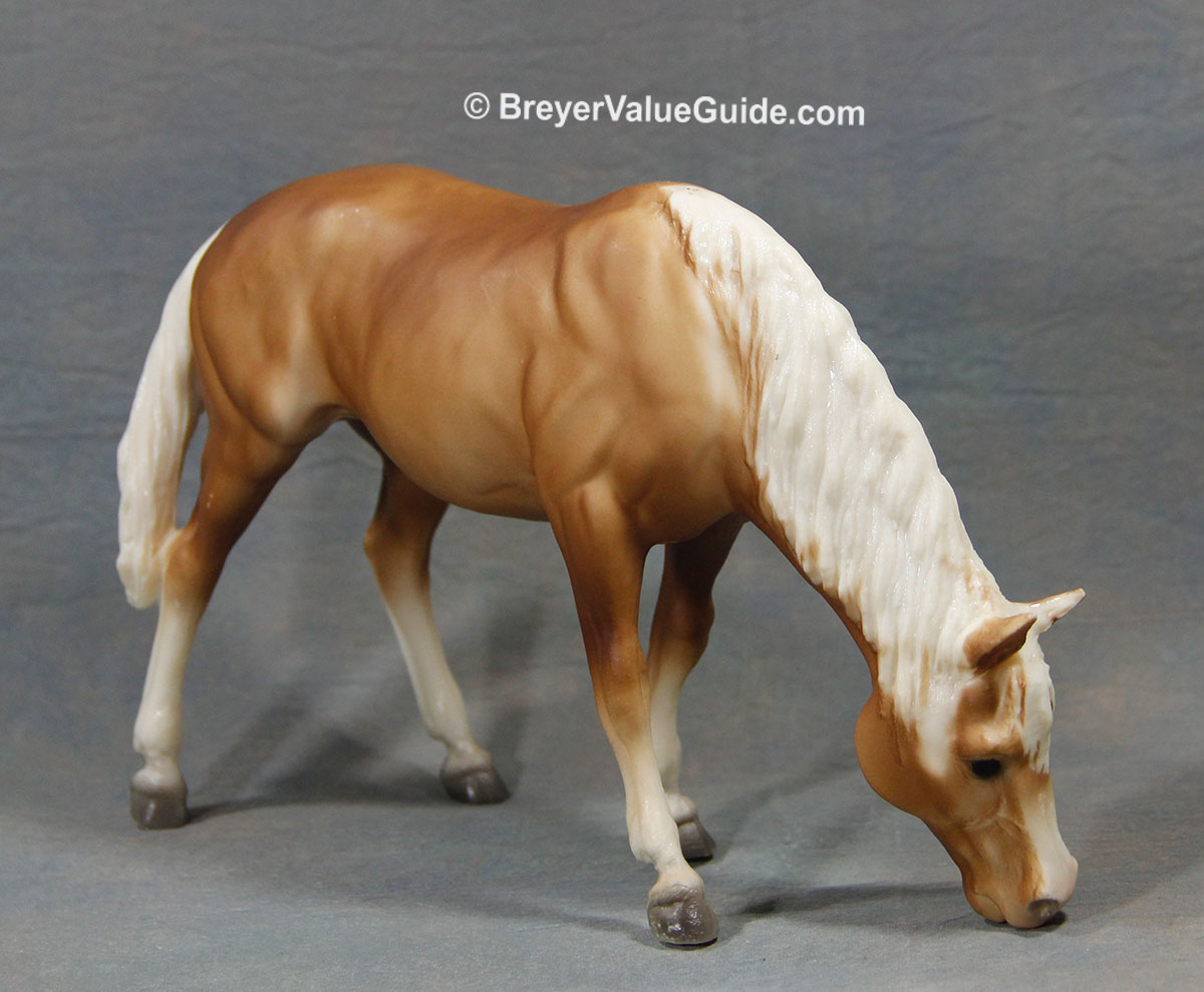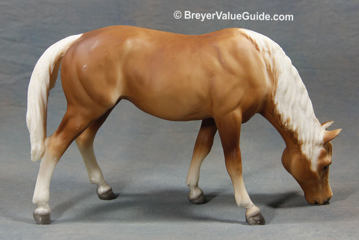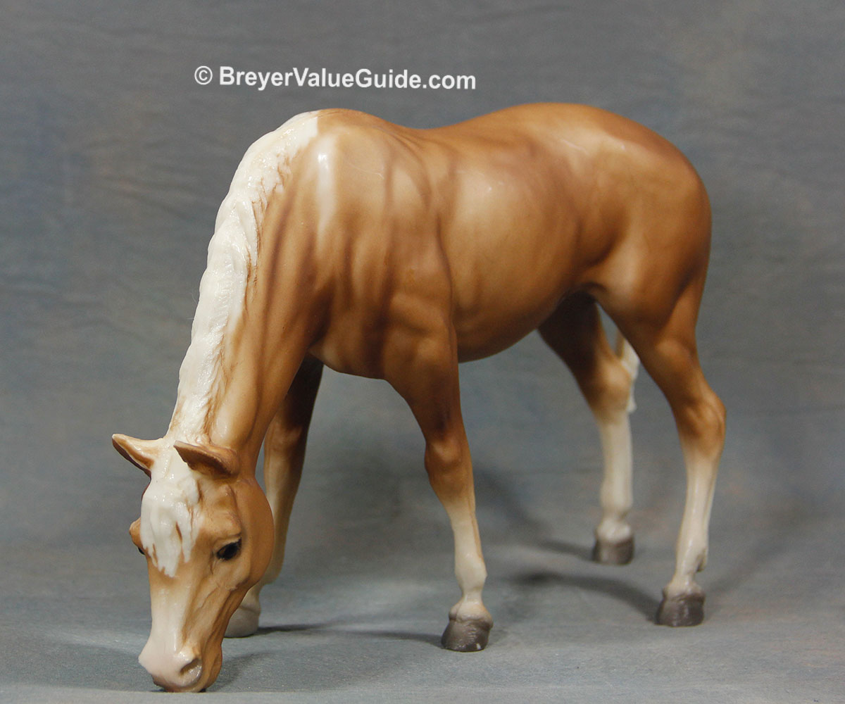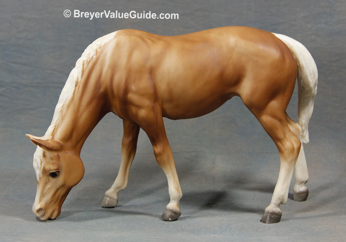 Matte palomino, bald face, 4 socks, grey hooves. Basecoat chalky variations known.