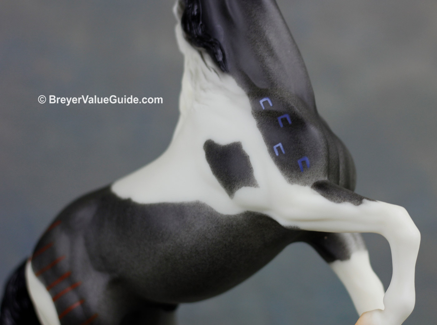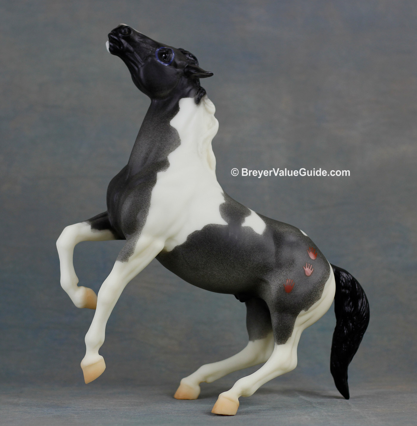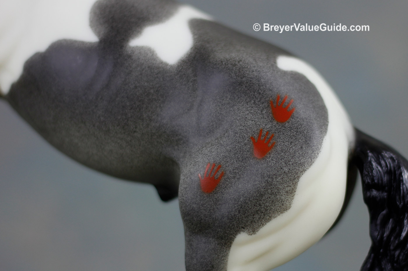 Matte blue roan pinto; white legs, natural hooves, blaze and chin spot, Native American symbols; QVC SR