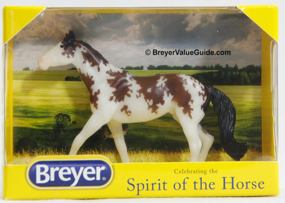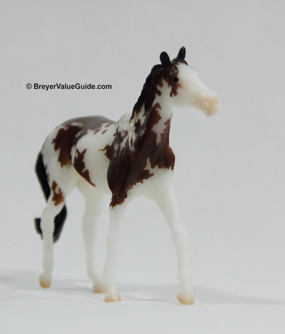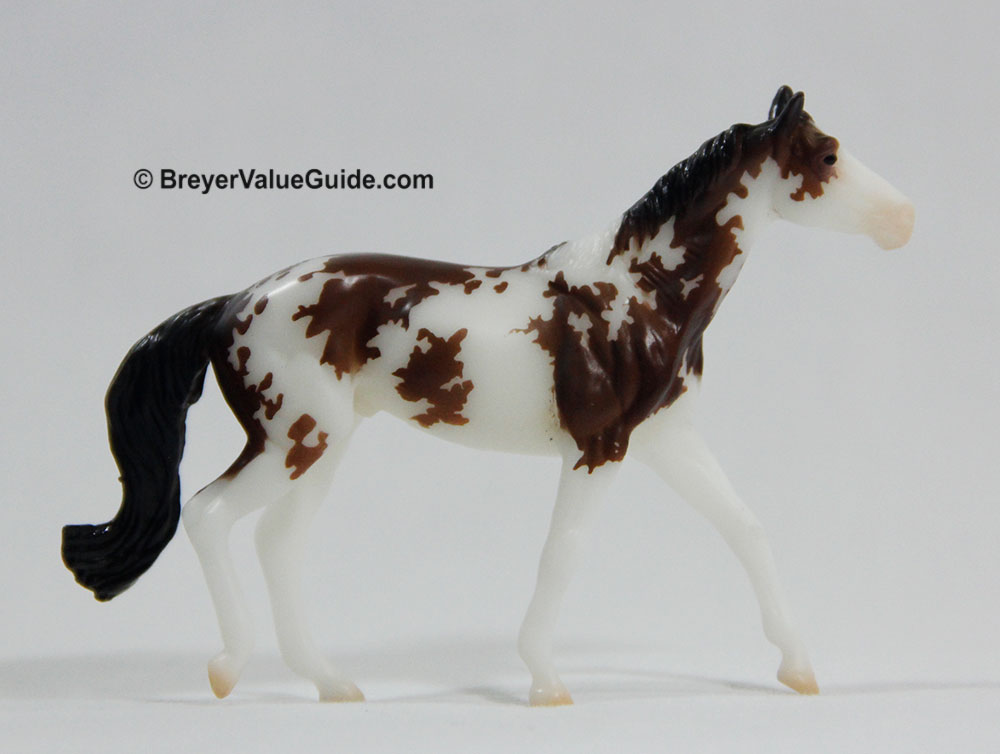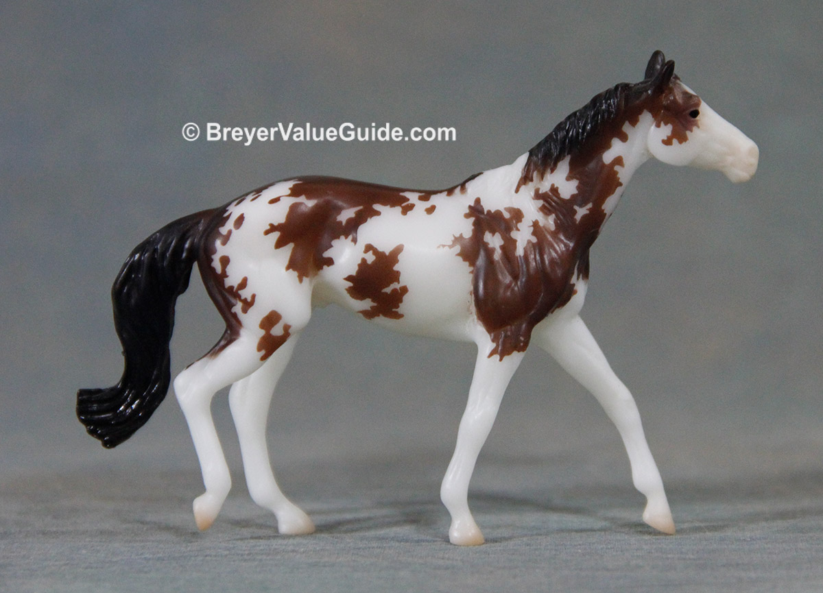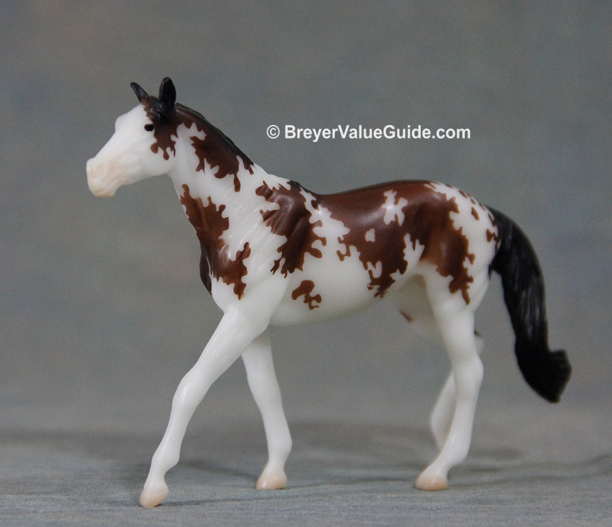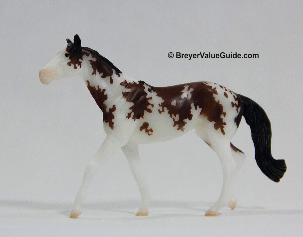 Matte bay sabino pinto, stenciled bald face, white legs, black mane and tail, Stablemates Club SR