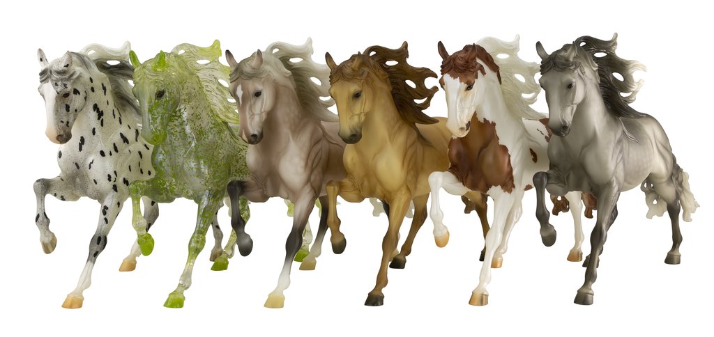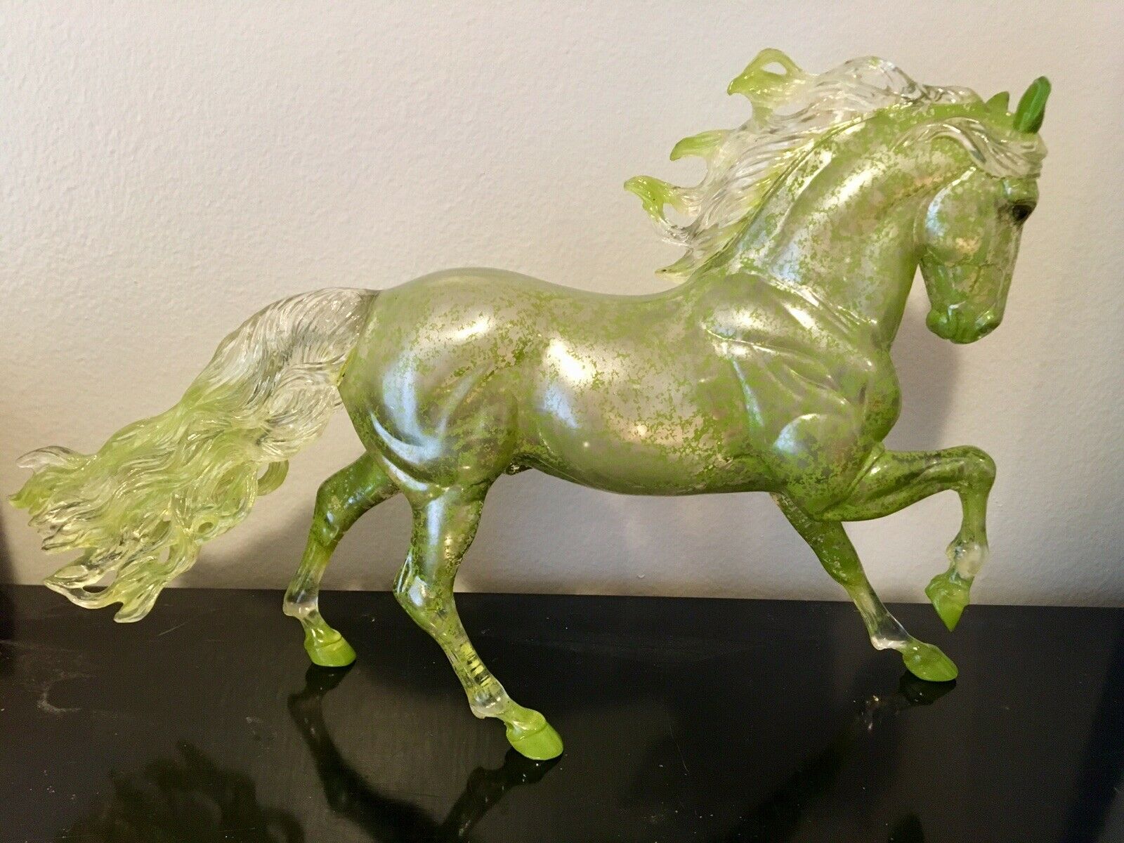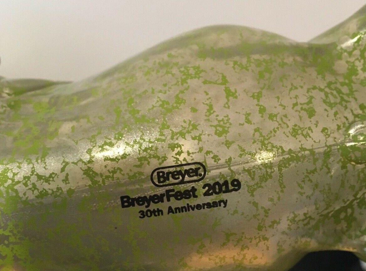 Glossy translucent with green resist spotting, green hooves, silver undertones, stamped “BreyerFest 2019 30th Anniversary”, BreyerFest SR, 1/400