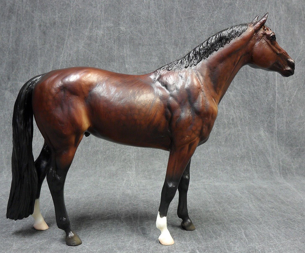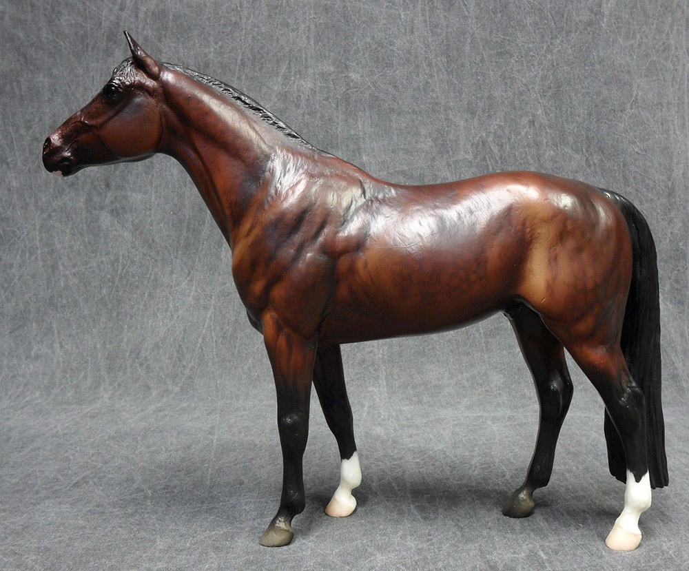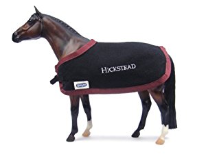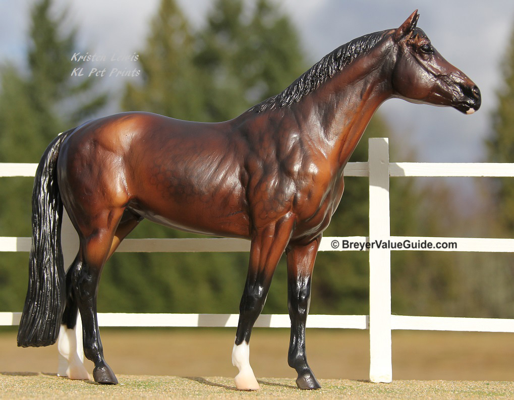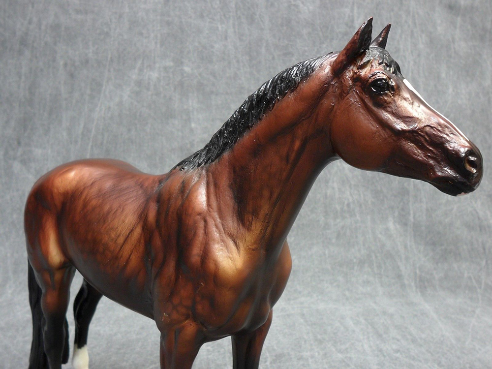 Matte shaded dark bay; dapples; stripe; chin spot; 2 socks; new style long tail introduced on this model; includes “Hickstead” blanket