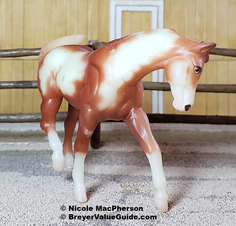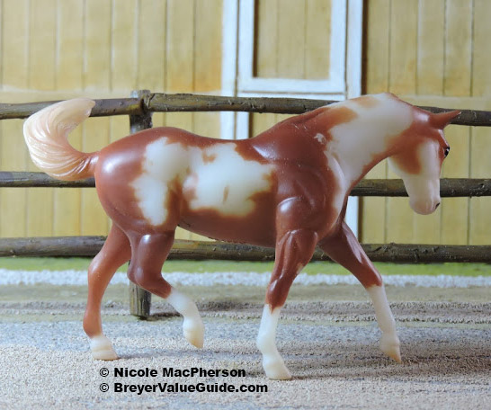 Matte chestnut pinto; detailed stenciled pattern; bald face; 3 stockings; 1 low sock – with Silky Sullivan, wagon, rider and tack
