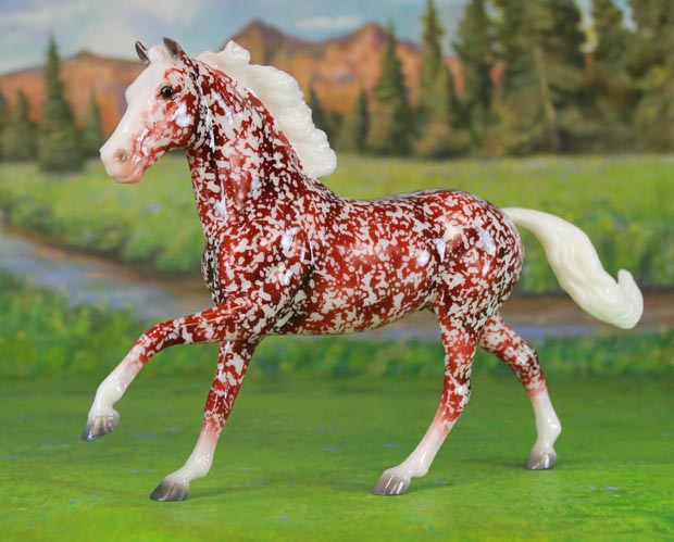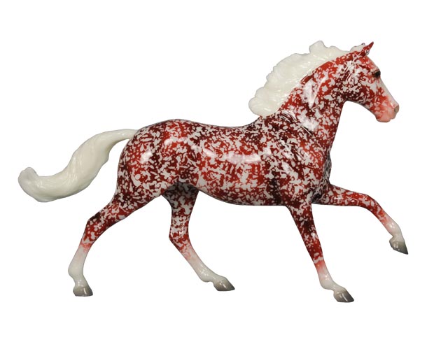 Glossy resist dapple dark red decorator; white mane and tail; 4 socks; Holiday Surprise Web SR; 1/350 Issue price: $95 Gamblers Choice with Ivy.
