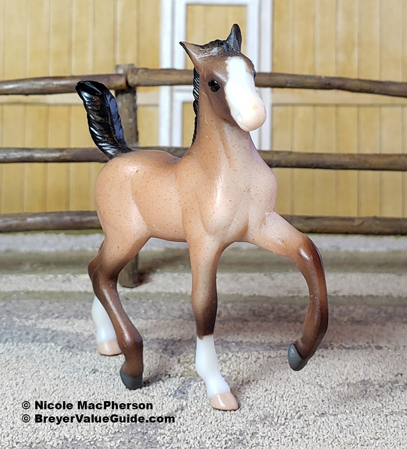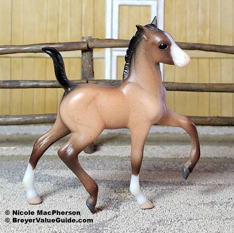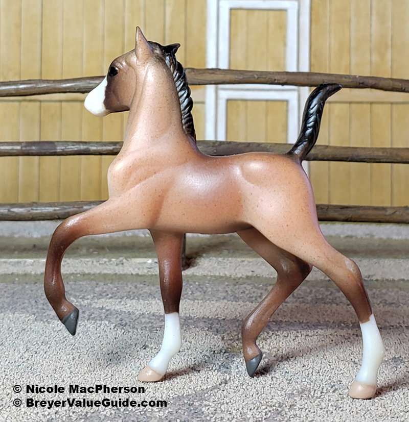 Matte red roan; apron face; darker mane and tail; 2 socks; Target release early 2006 – with Cantering Warmblood