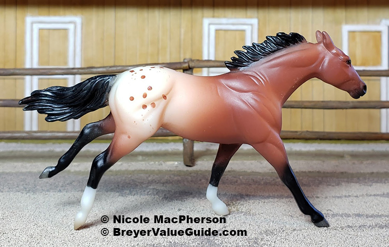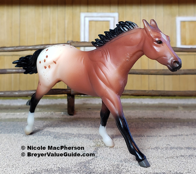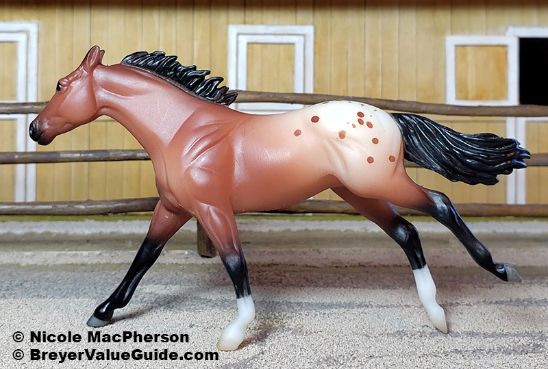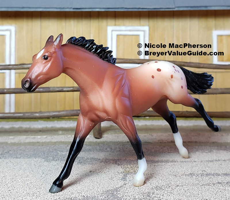 Matte bay blanket appaloosa; splash spots; diamond star; black points; 2 socks – with Trotting Foal