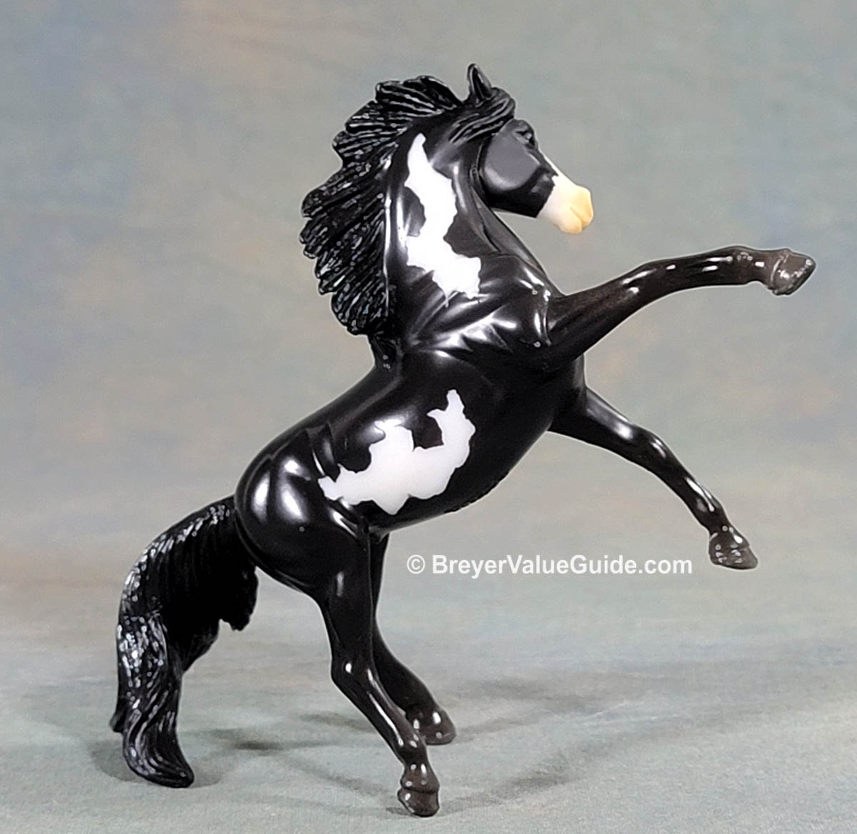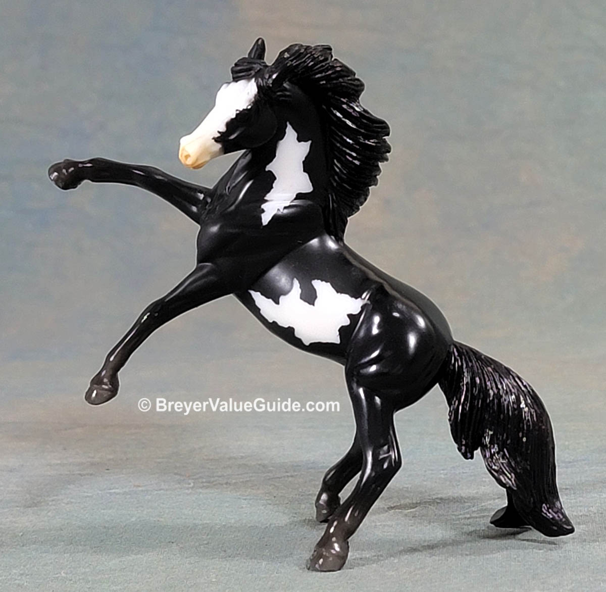 Matte to semigloss black pinto; wide blaze over muzzle; grey hooves