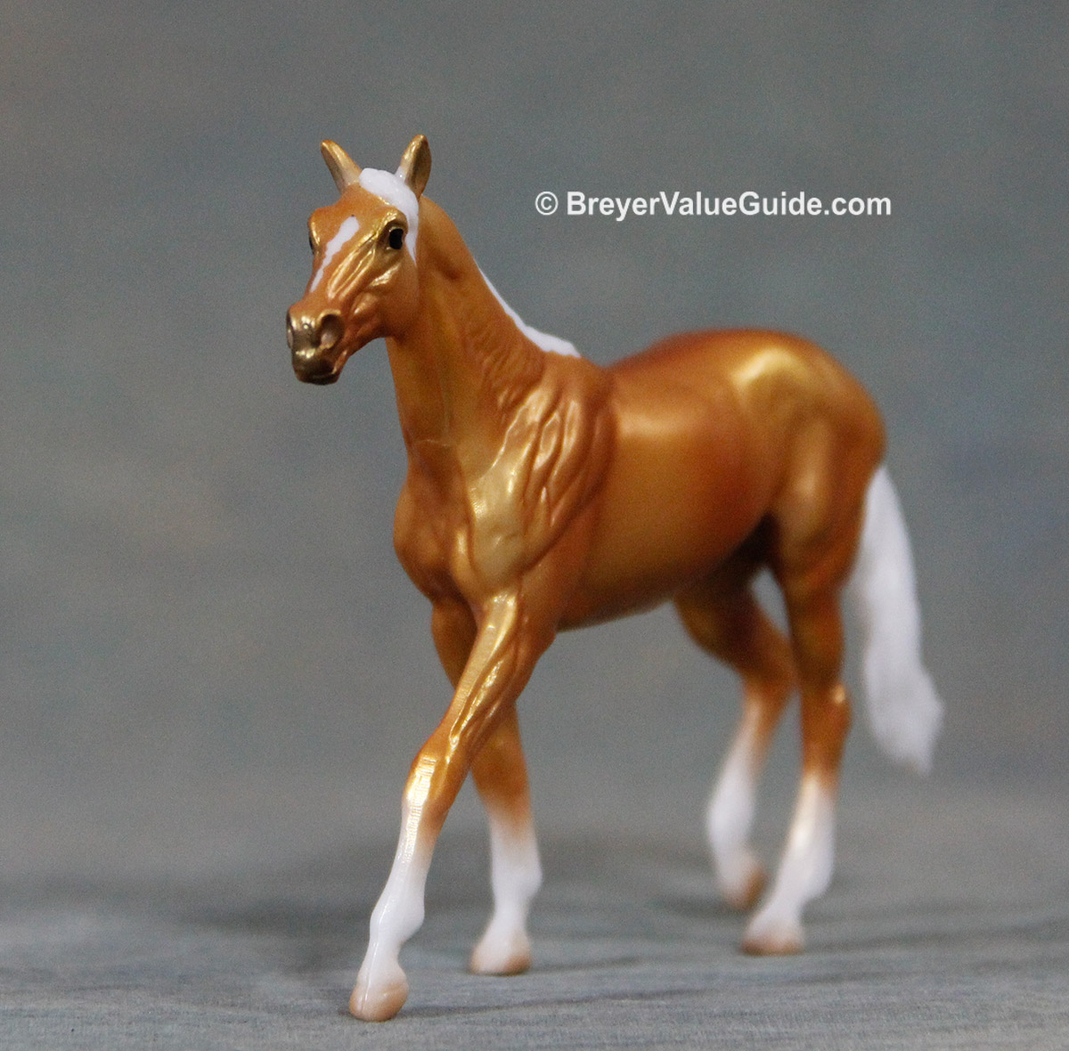 Matte metallic palomino, white mane and tail, stripe, 4 socks – with Cantering Warmblood and Scrambling Foal Similar to or the same as #6049 Issue price: $10 set