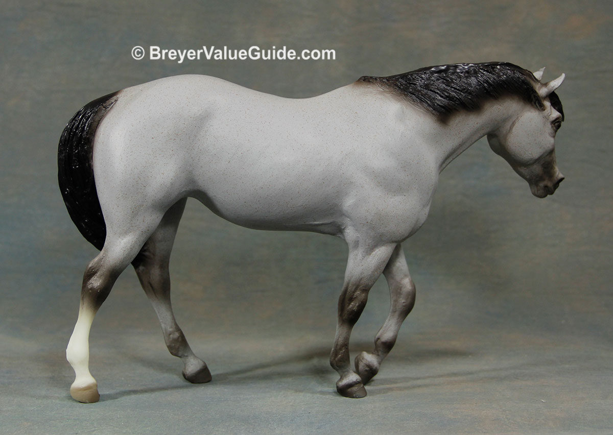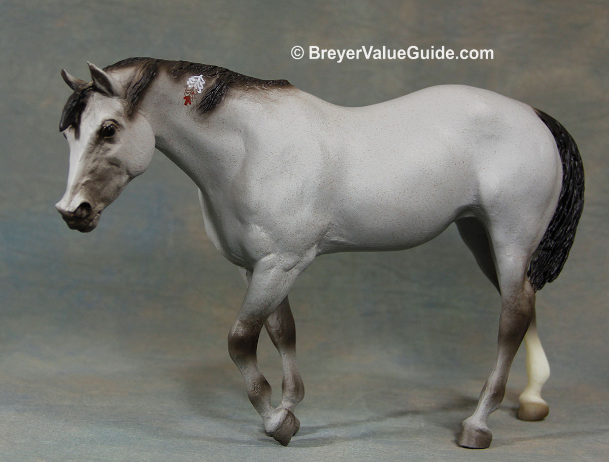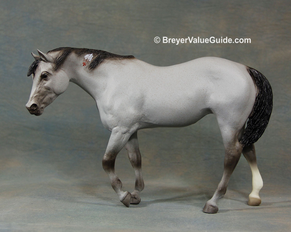 Matte light grey; chestnut fleabites; hind sock; dark mane and tail, feather painted on mane