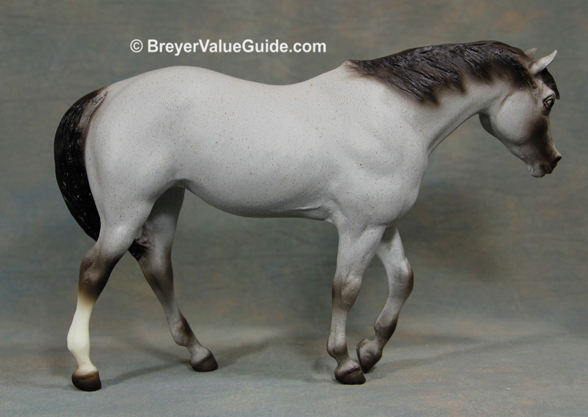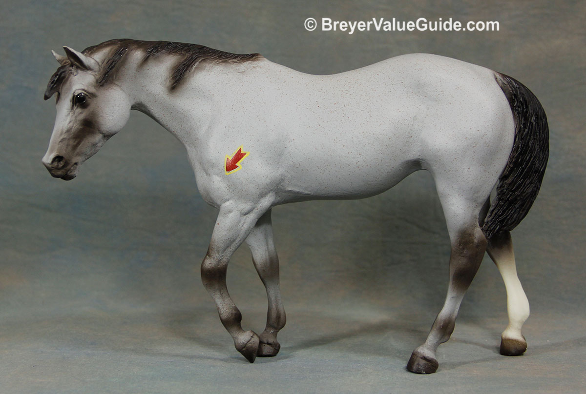 Matte light grey, chestnut fleabites; hind sock; dark mane and tail, red and yellow arrow on shoulder