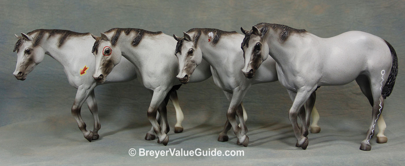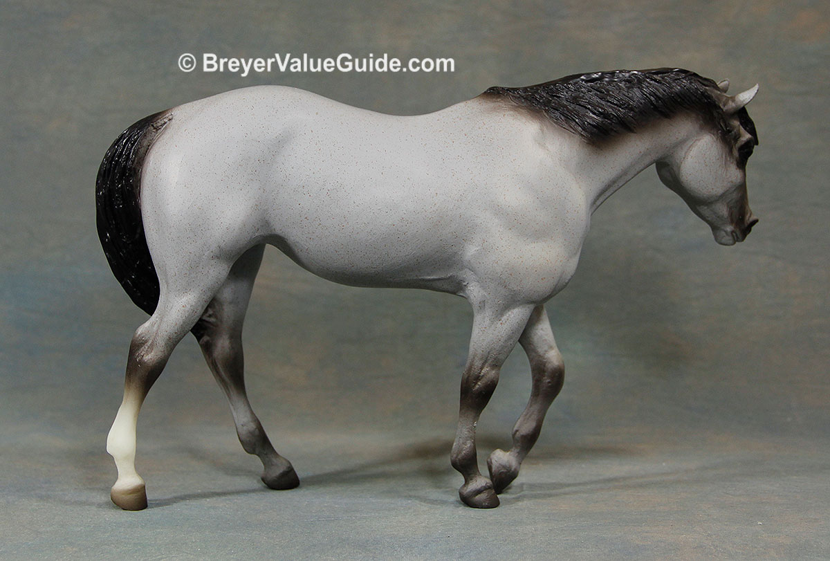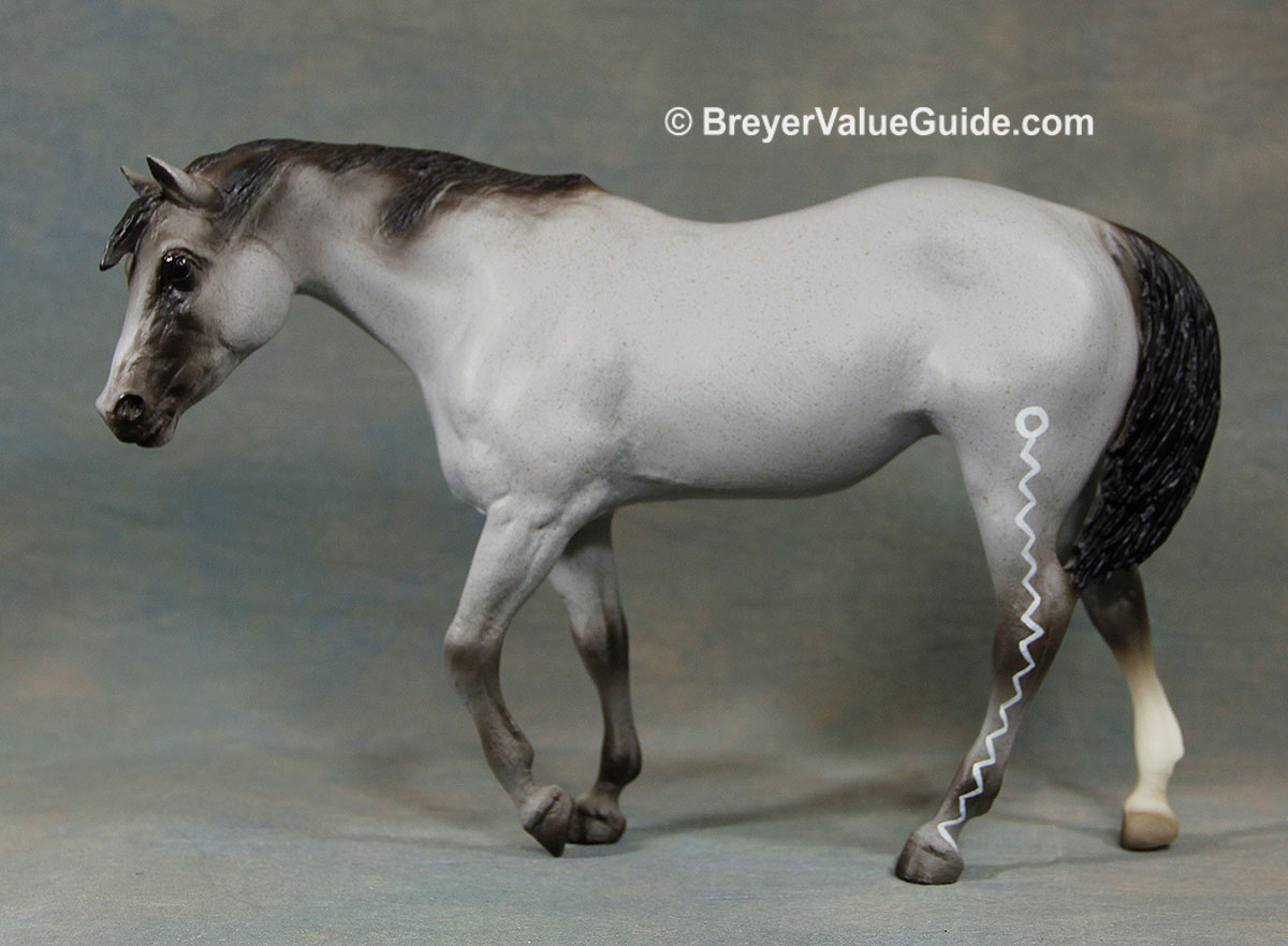 Matte light grey, chestnut fleabites; hind sock, dark mane and tail, white zig-zag on left hind leg