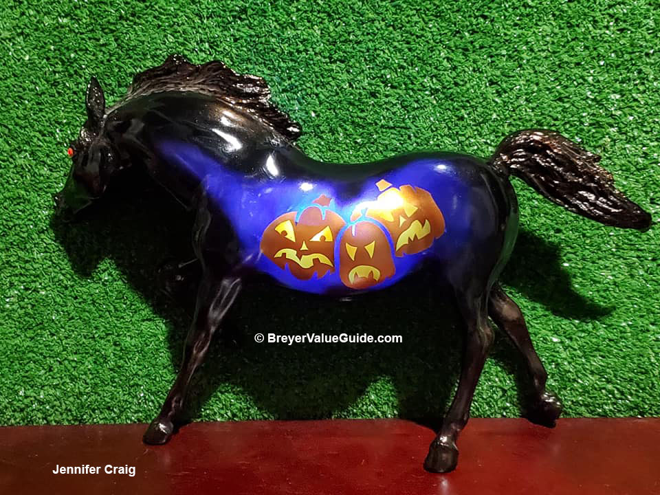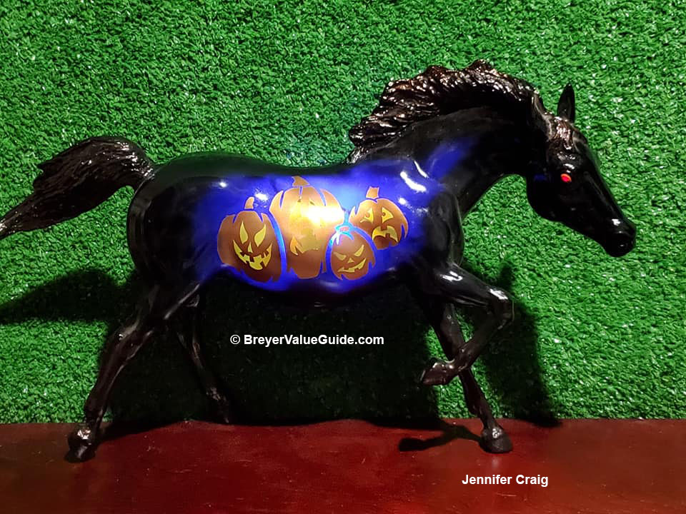 Translucent dark blue plastic; pumpkin design; red eyes; internal light; Halloween SR