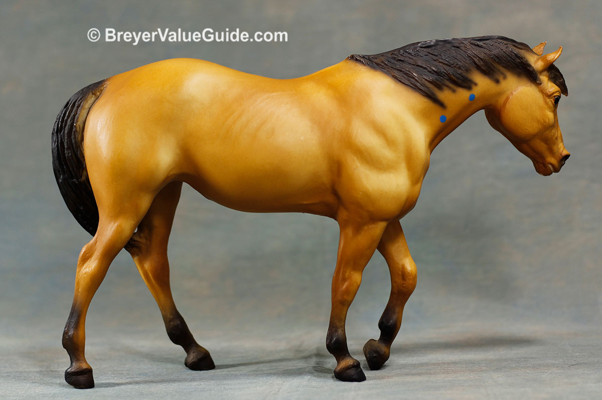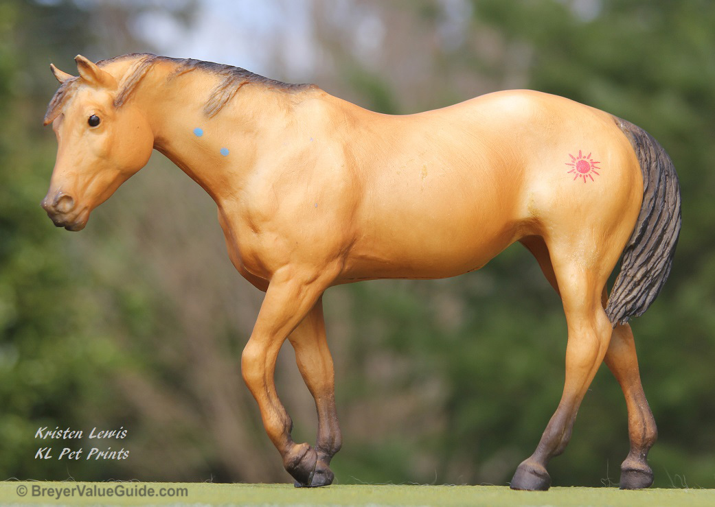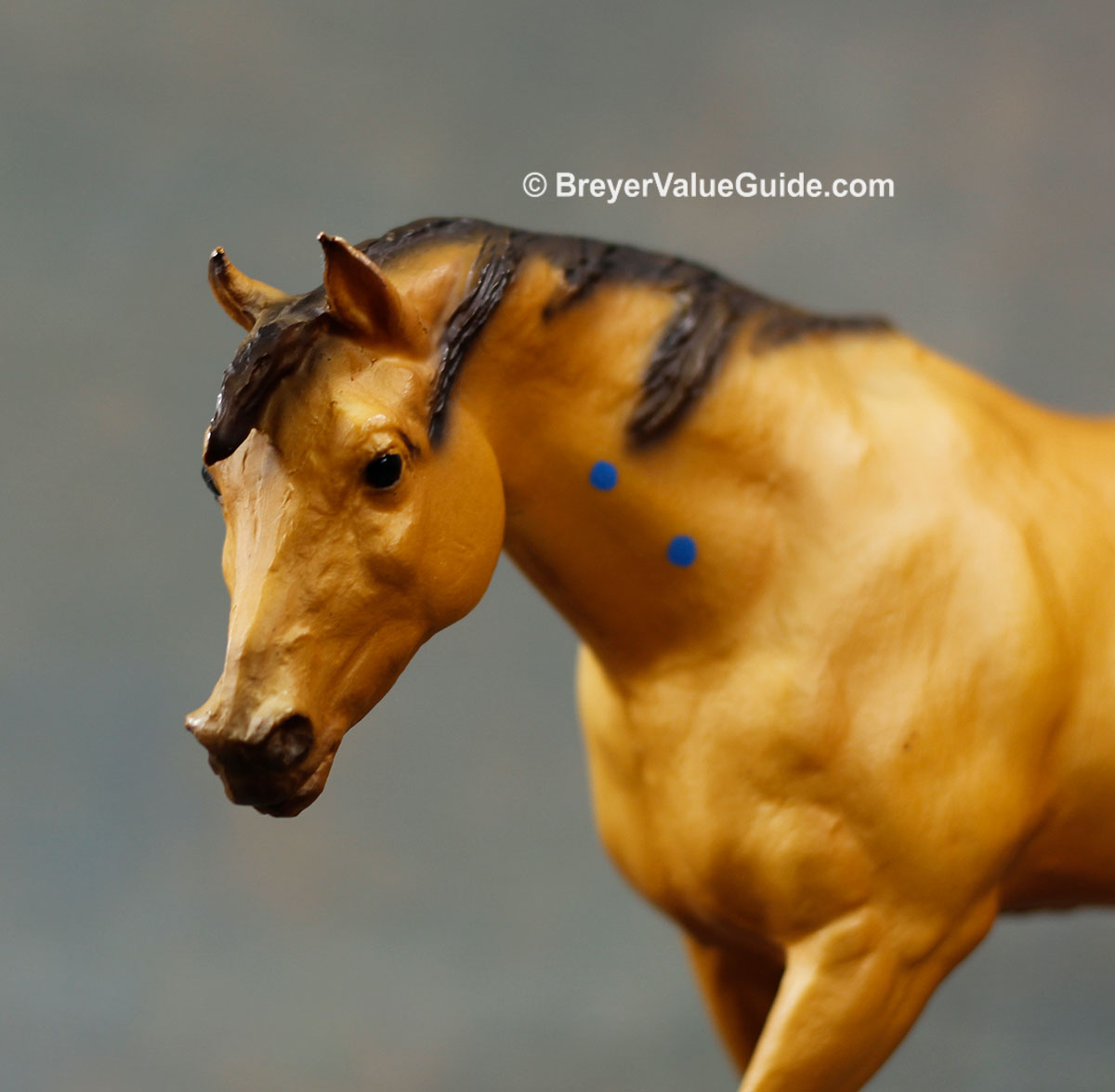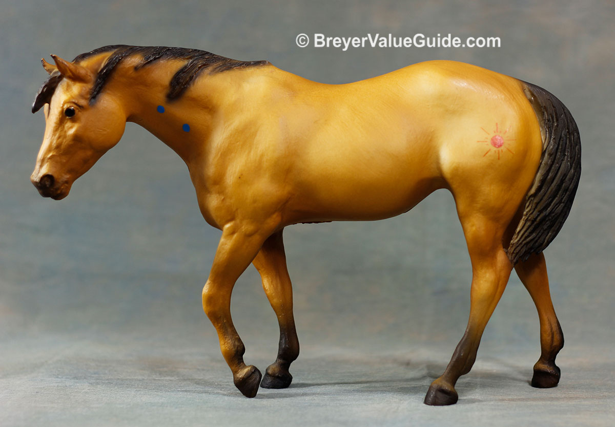 Matte buckskin; 2 blue dots on both sides of neck, red sunburst on left hip