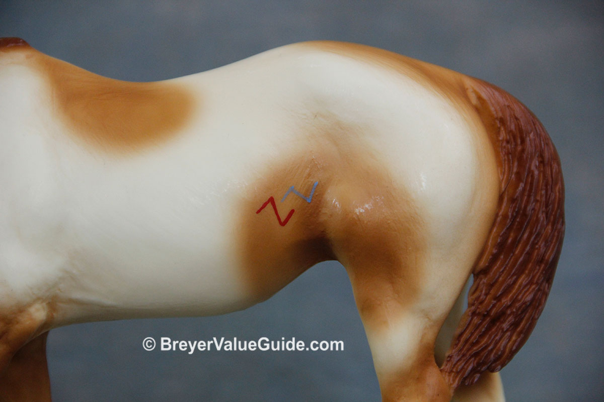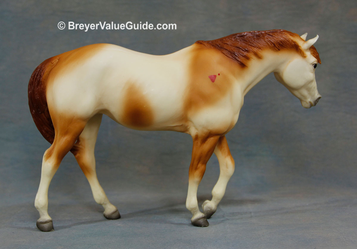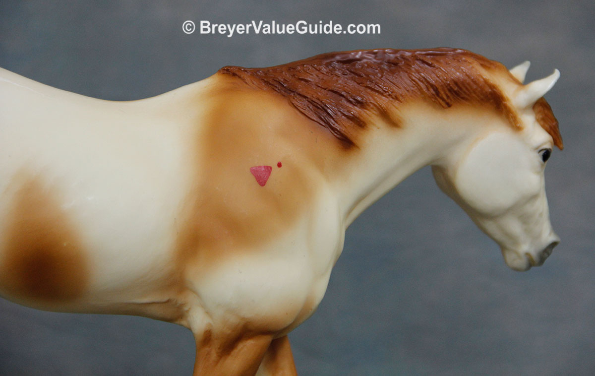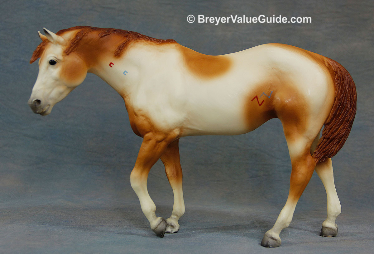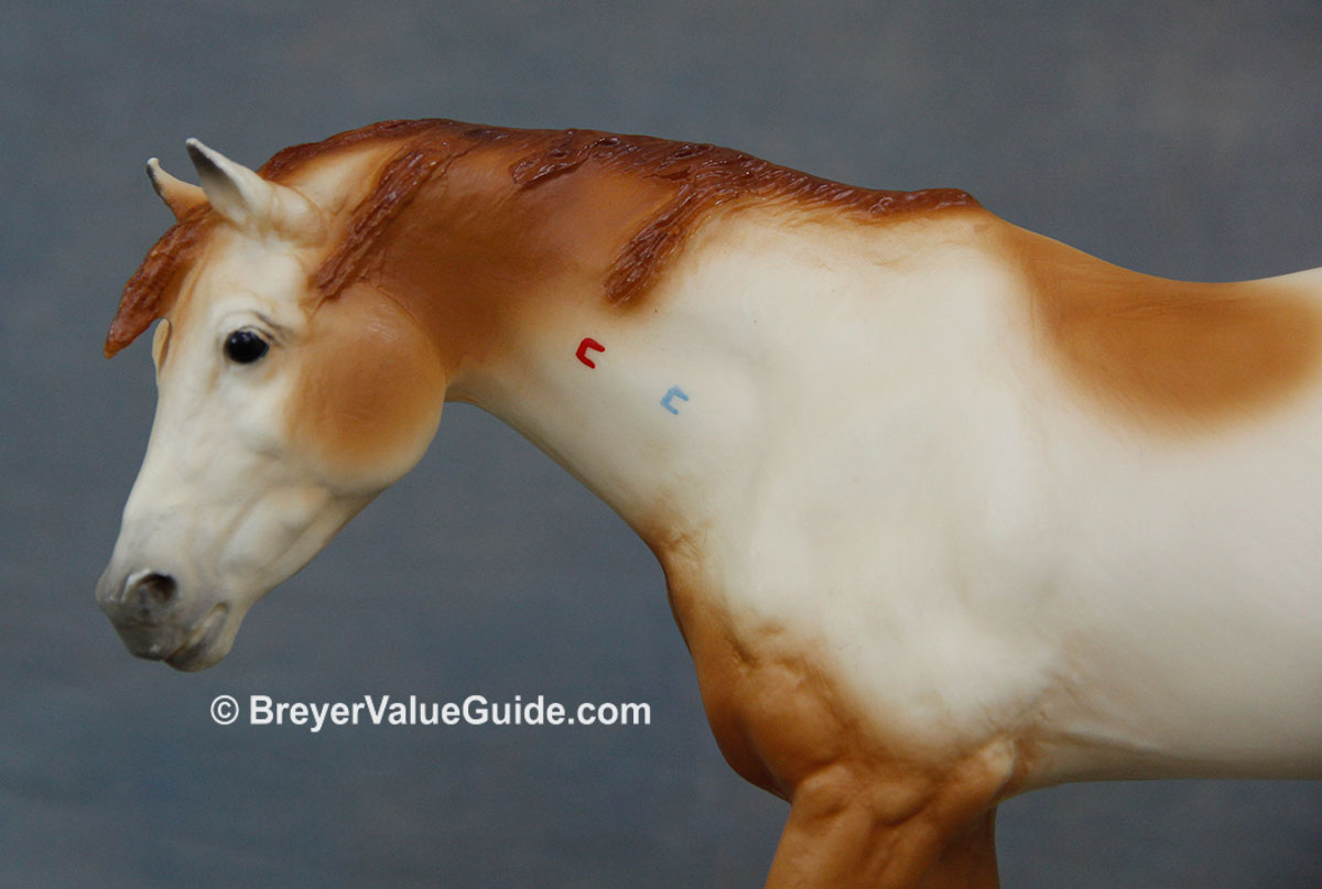 Matte chestnut pinto, grey muzzle, grey hooves, red and blue war paint markings on shoulder, neck and flank