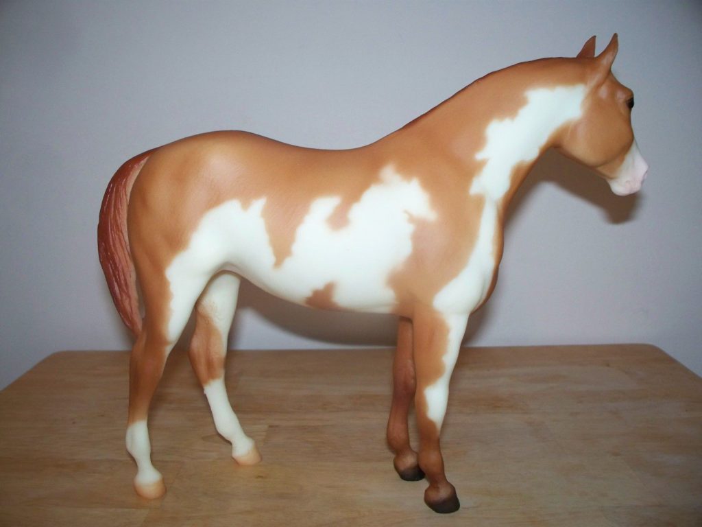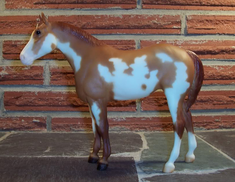 Matte apricot dun pinto; apron face; 2 hind socks; Breyer Show Special