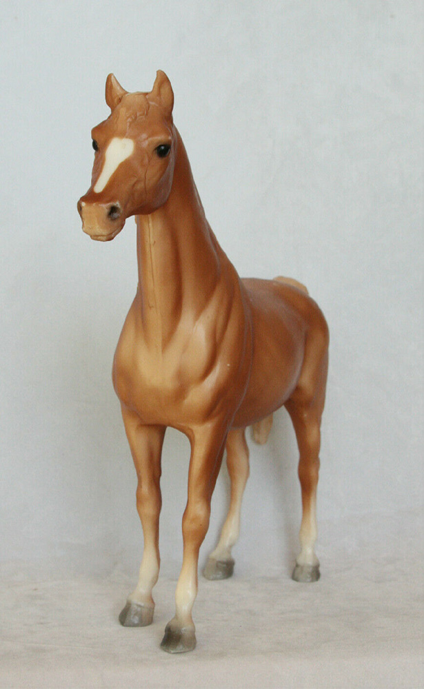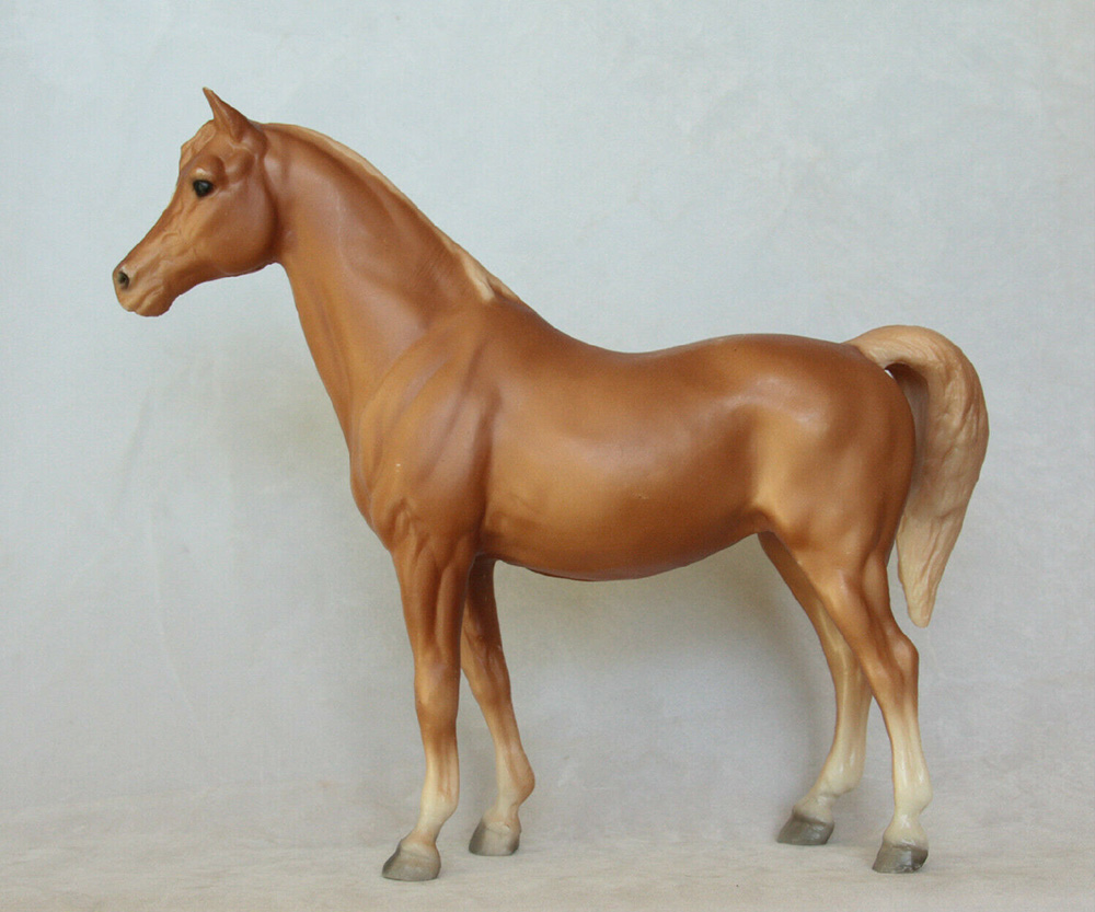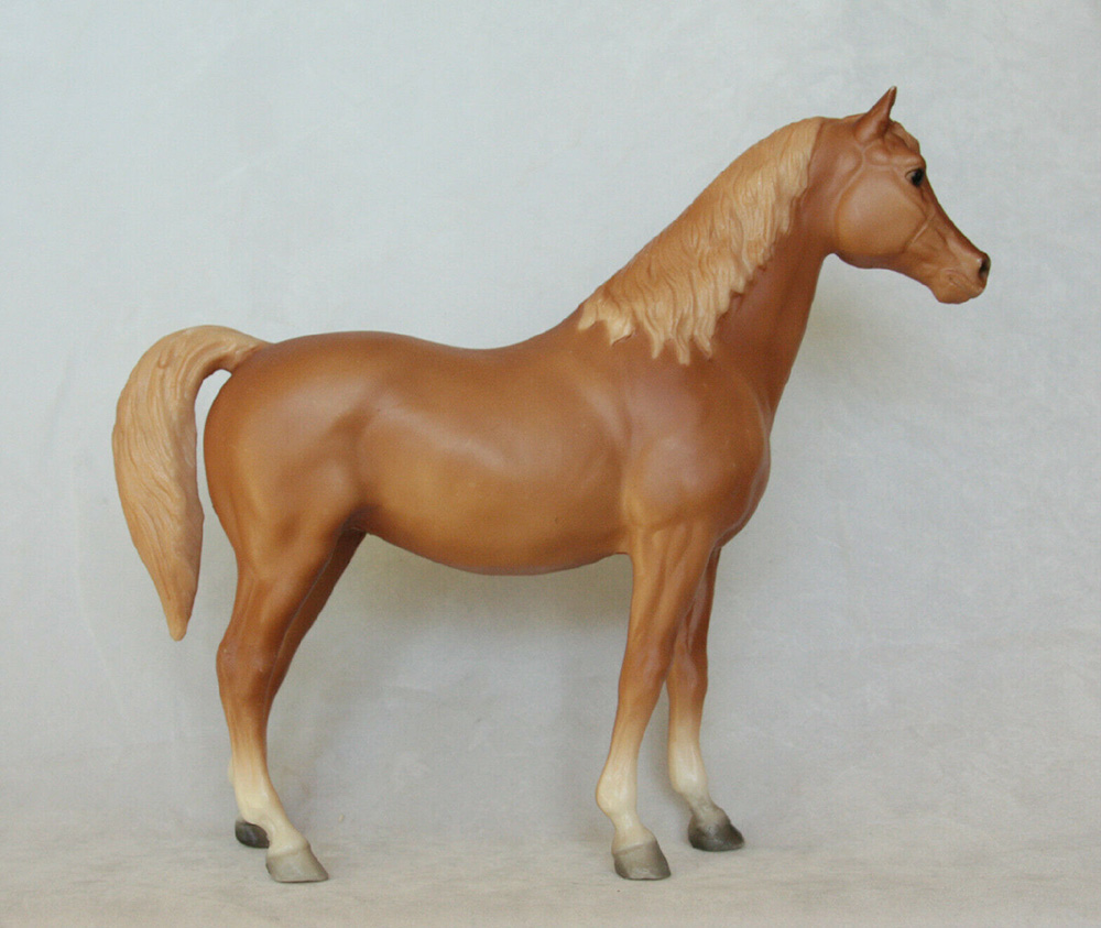 Matte chestnut/sorrel; flaxen mane and tail; blaze; 4 socks; grey hooves; JCPenney SR – with Family Arabian Stallion and Family Arabian Foal