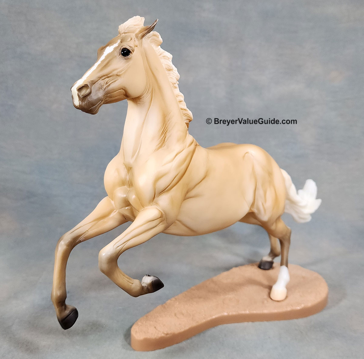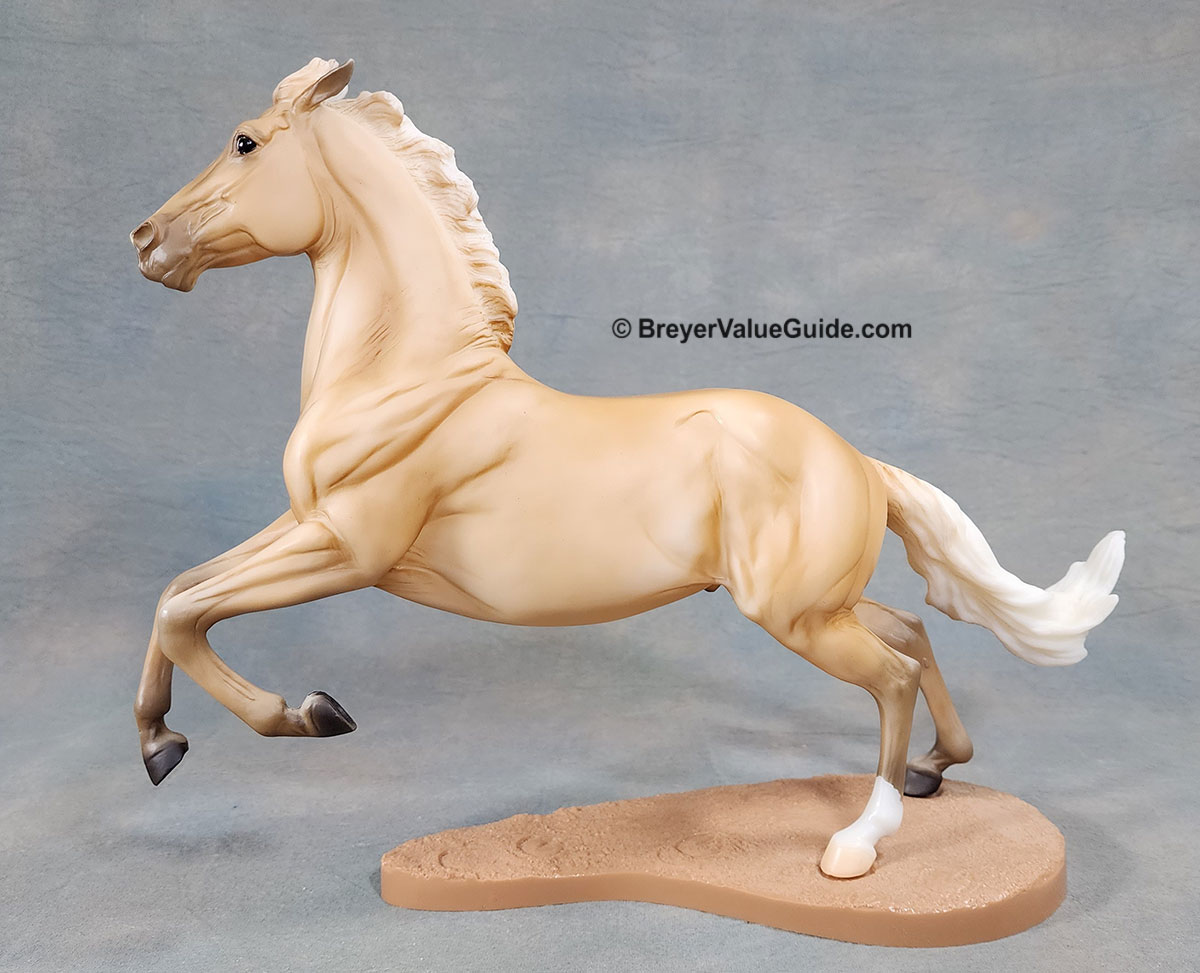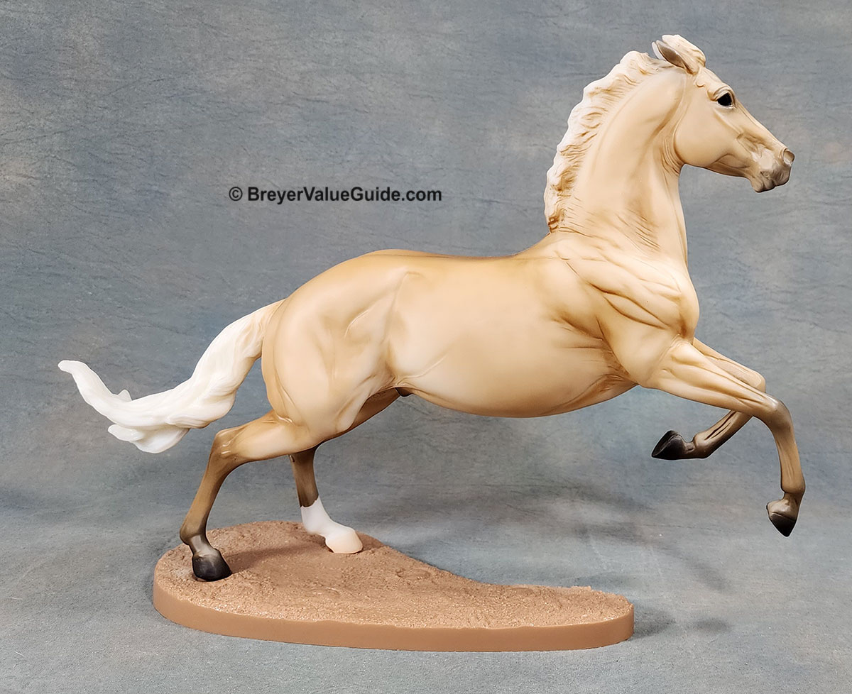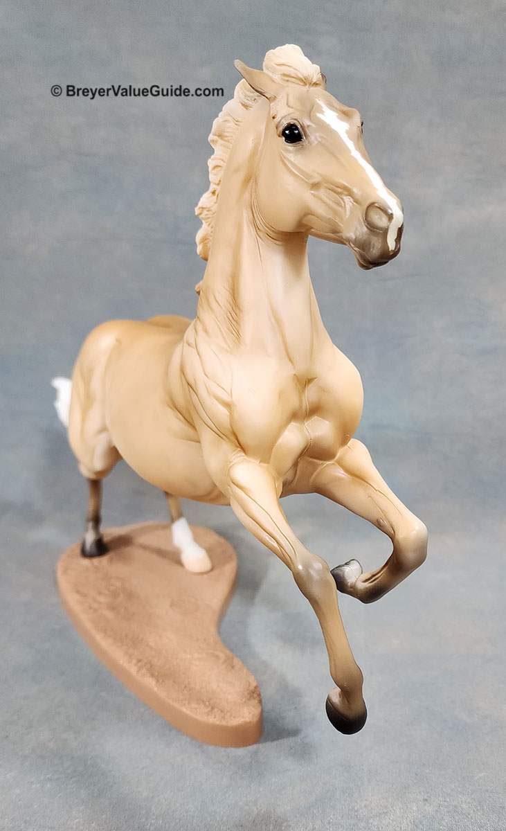 Matte shaded palomino; stripe; 1 hind sock; basecoat chalky variations known; Tractor Supply SR