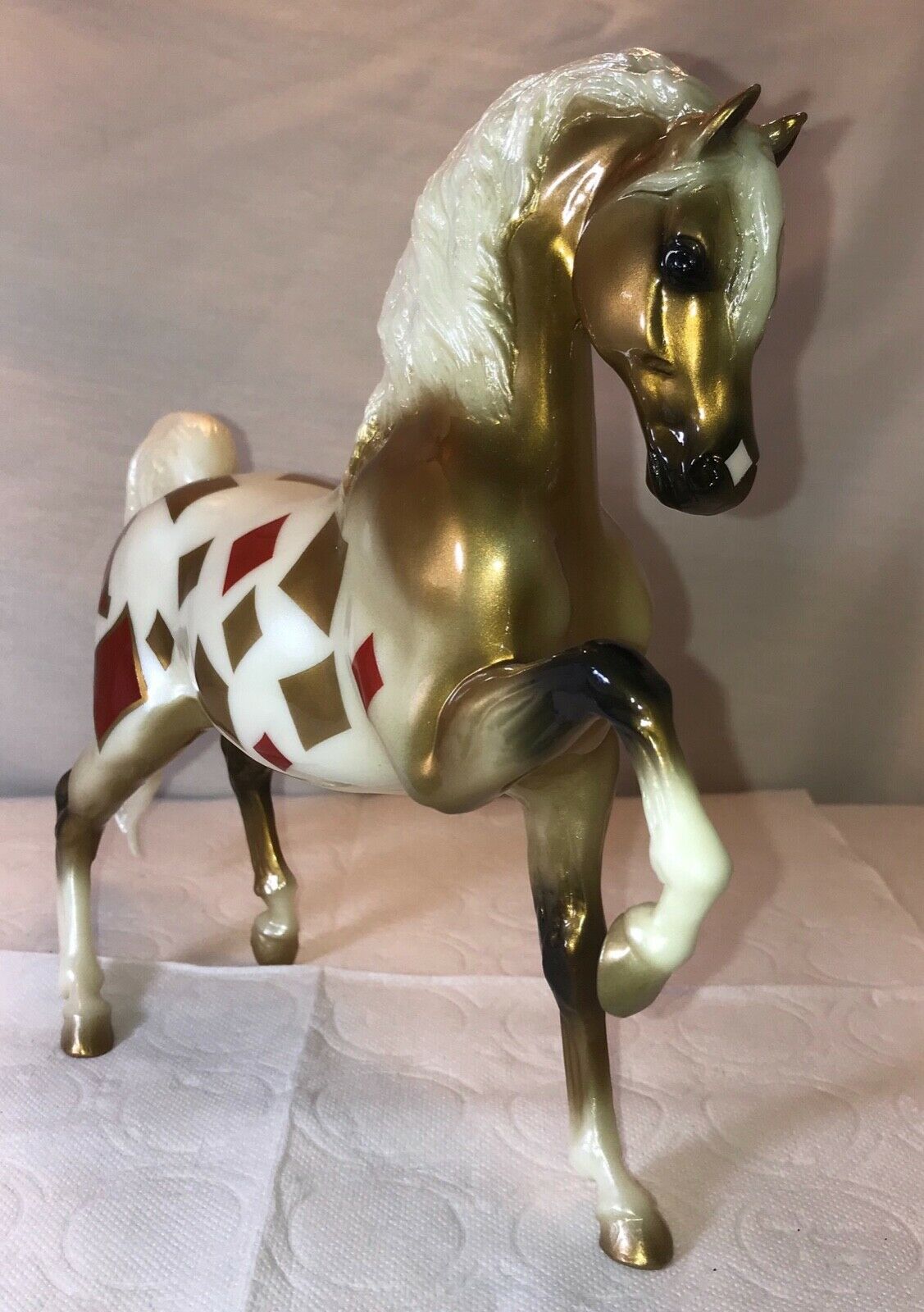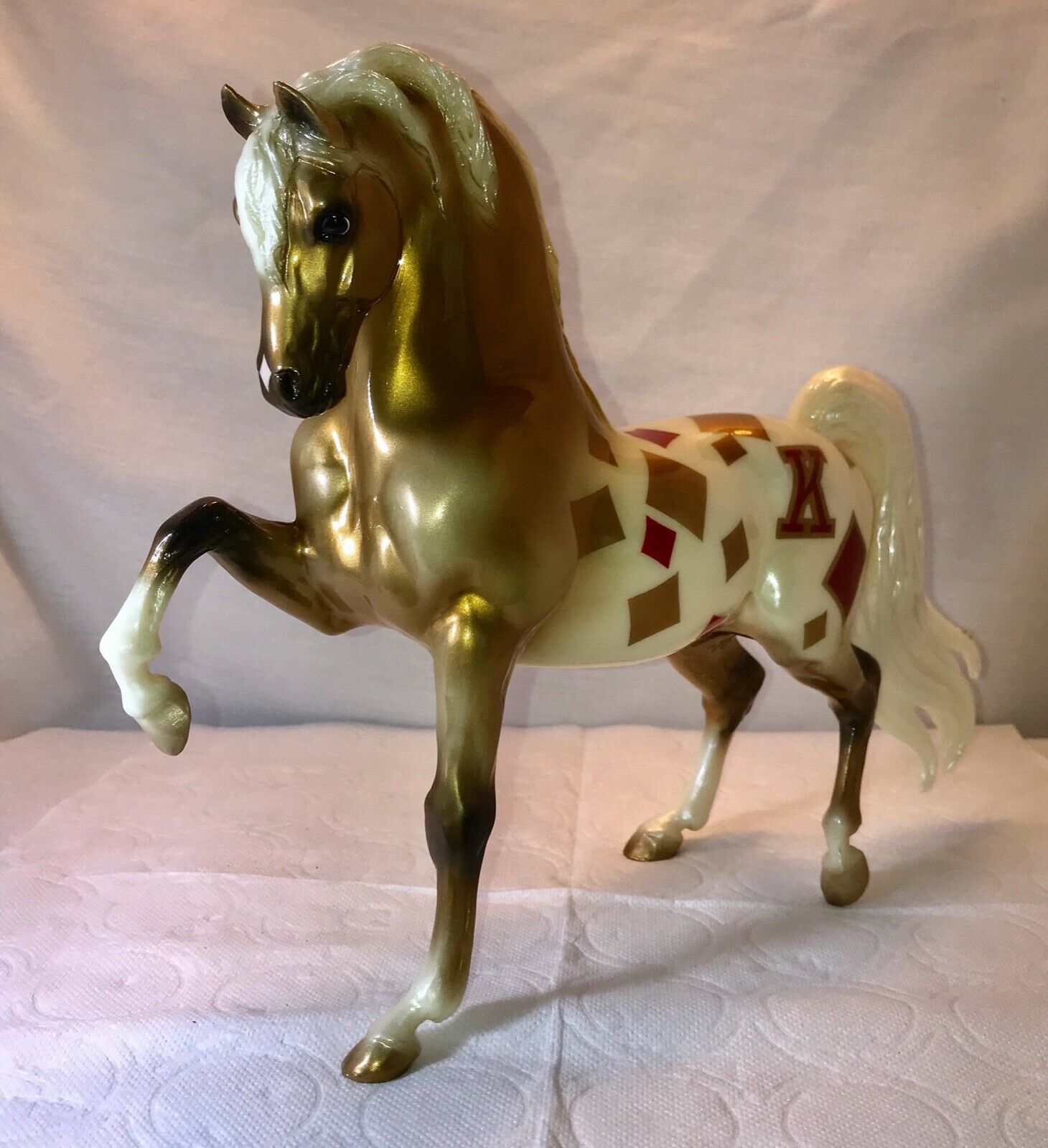Glossy gold and white; diamond shaped snip; diamonds pattern in red and gold; “K” on hip; Connoisseur SR; 1/100